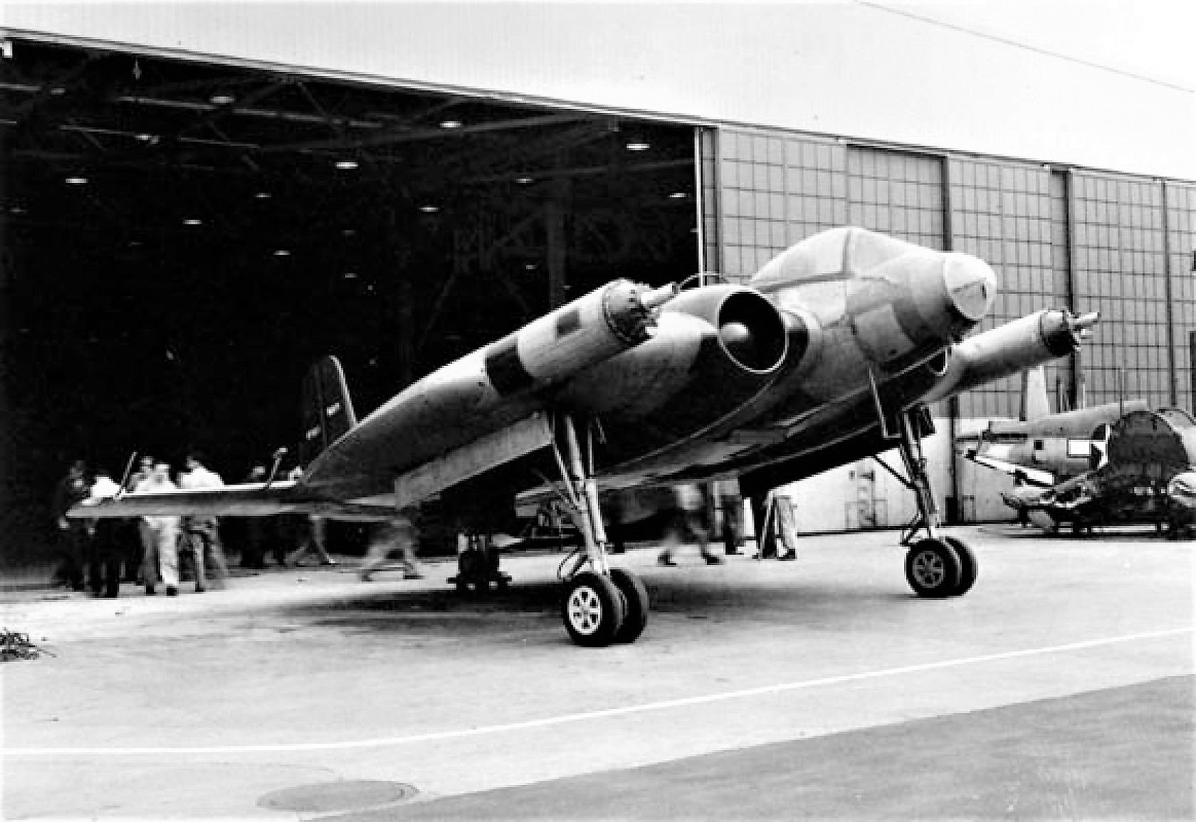 The completed XF5U ready for primary engine runs with F4U-4 propellers. The aircraft was completed over a year before the articulating propellers were finished. Had the propellers been ready sooner, it is likely the XF5U would have been transported to Edwards Air Force Base for testing in late 1945.