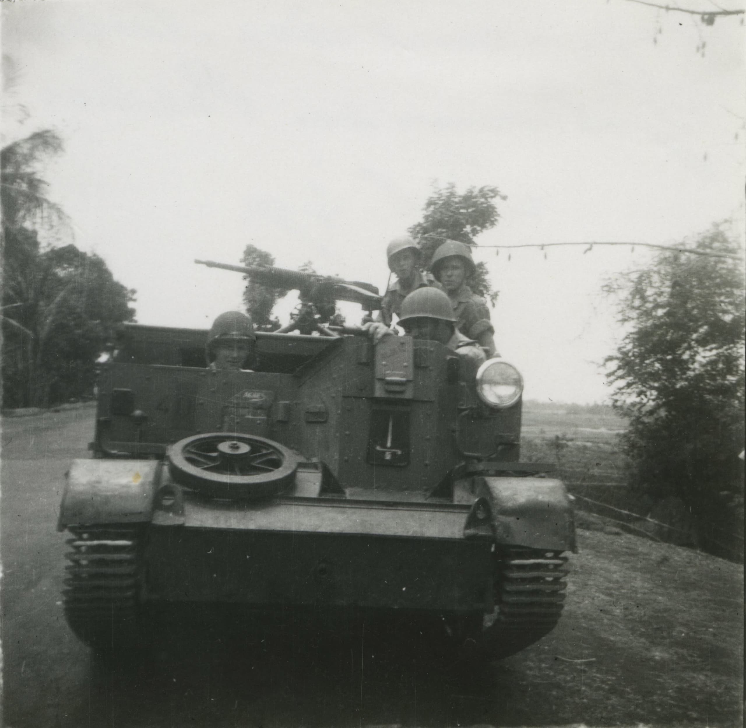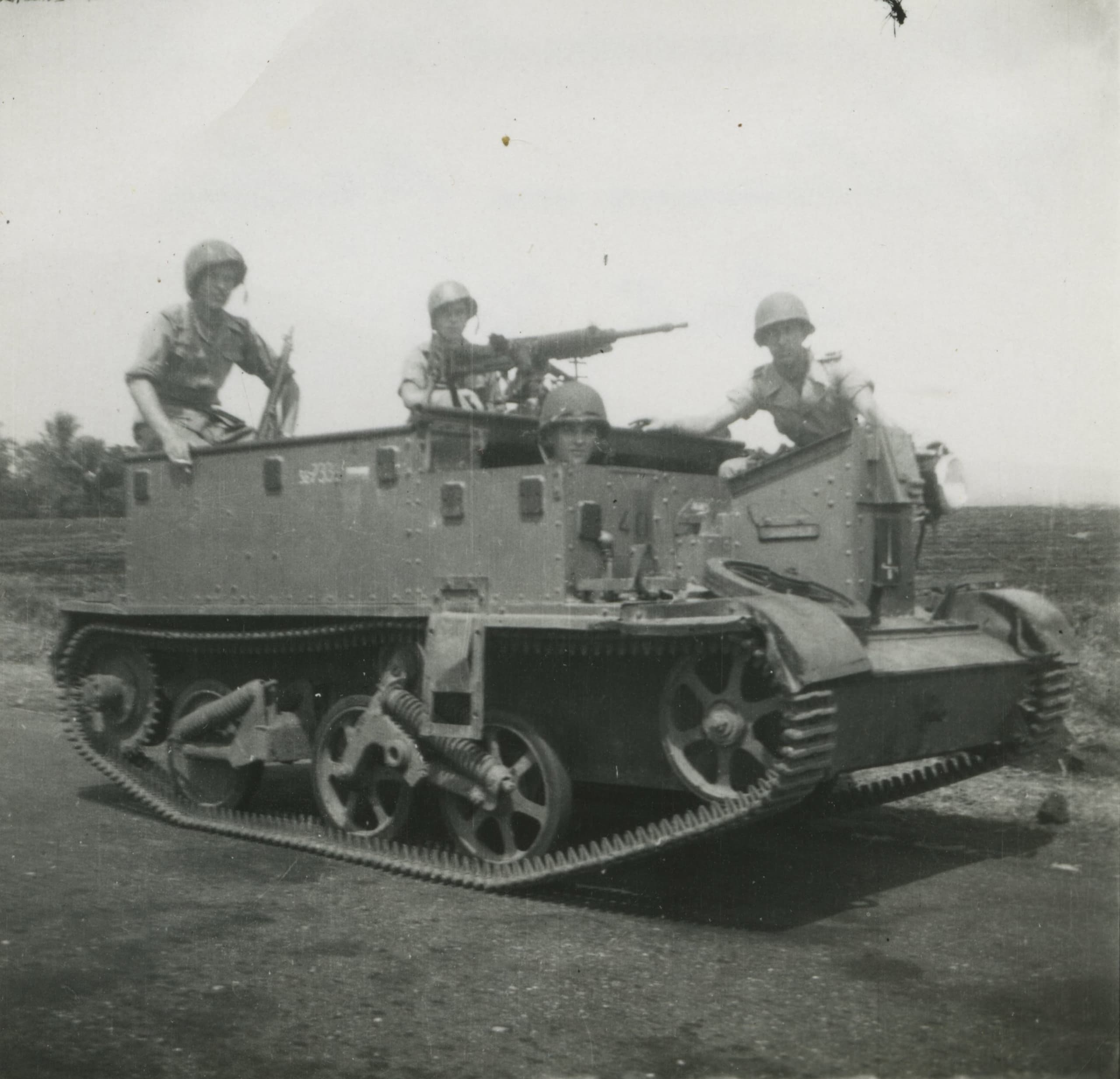 The crew of this Universal Carrier I’m suggesting here got their hands on a Japanese 7.7 mm Type 92 heavy machine gun. This machine gun was mounted on a tripod that was located in the middle of the carrier. This gave the machine gun excellent firing angles, but lacked any kind of protection for the crew. It is unclear why it was decided to use a Japanese machine gun, my best quess is that there was a surplus of them and plenty of ammunition to put them in service.