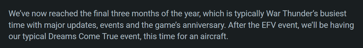 Just saw the news today, makes me a little sad there is no ground event vehicle but at the same time, I’m really looking forward to what the air vehicle could be! Maybe in the future, they could update the dreams come true that they run multiple vehicles at the same time so each branch of vehicles can get some appreciation (even naval).