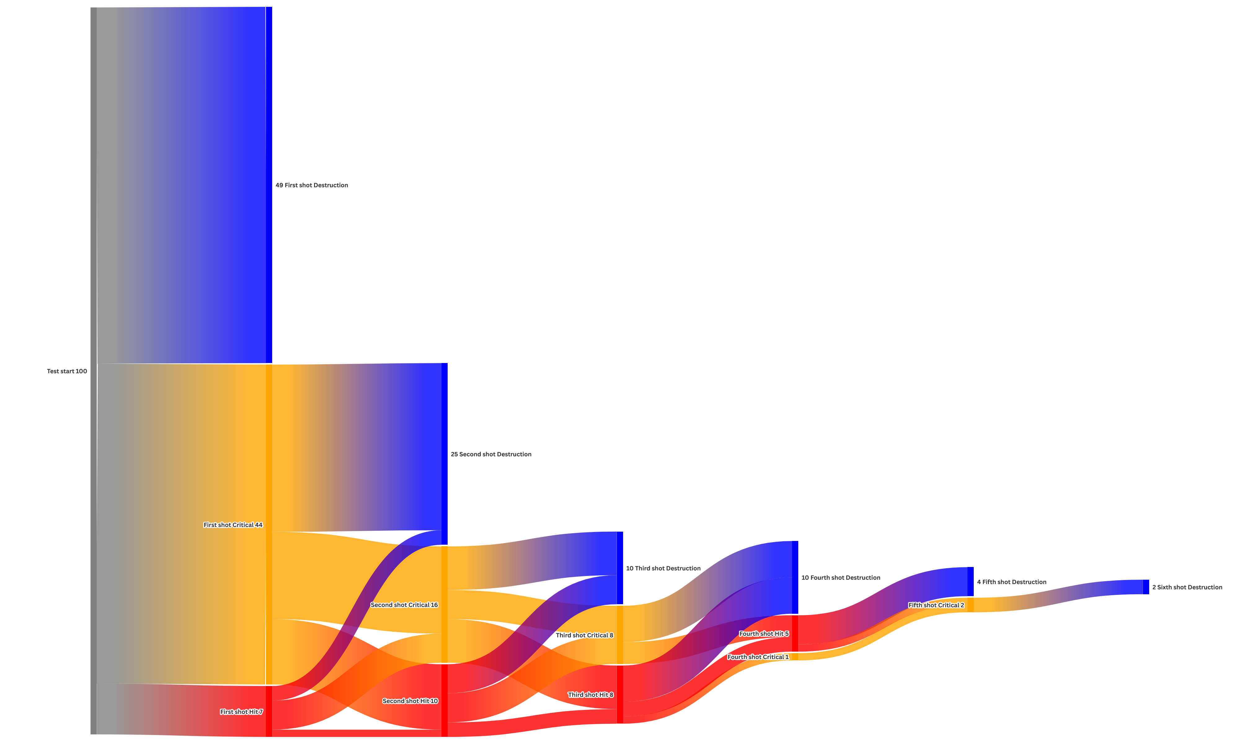 How to read the results : each step from left to right represents a shot. Once the vehicle is destroyed (blue), the sequence stops. If the vehicle is just critically damaged (orange) or hit (red), a following shot is made. Each time a shot is made, there is a smaller chance the T-64 survives, and on a 100 shots sample, the sequence never ended after more than 6 shots (2 occurences, as can be seen on the graph)