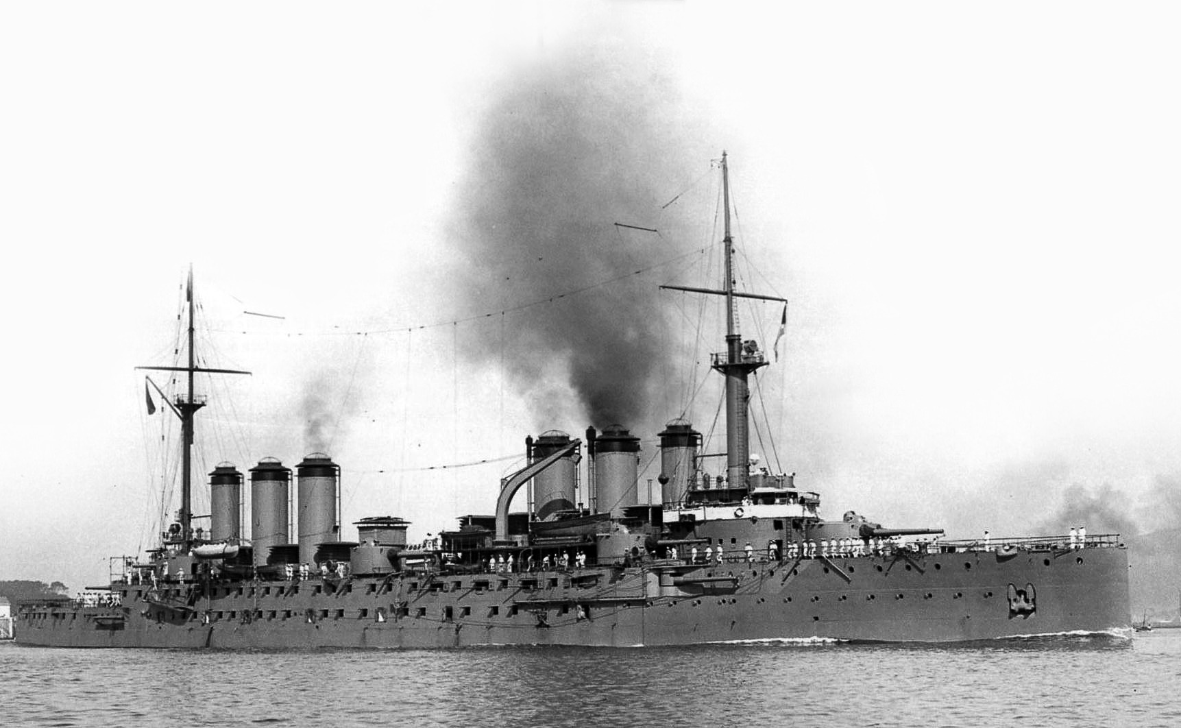 The ship was powered by three steam engines and 40 boilers, generating 36,000 horsepower, allowing it to reach a speed of 23 knots and a range of 10,000 nautical miles at 10 knots. Its crew consisted of 860 to 890 sailors.