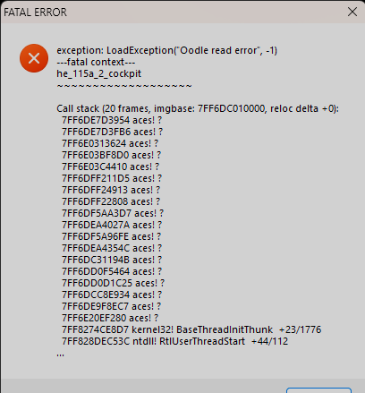 game randomly crashes and gives this error code, and always references a cockpit of a aircraft. checking files did not work, deletign chache did not work, reinstalling did not work, uninstalling and reinstalling drives did not work, changing install location did not work, changing graphic’s settings did not work, made sure overclocking was not on,