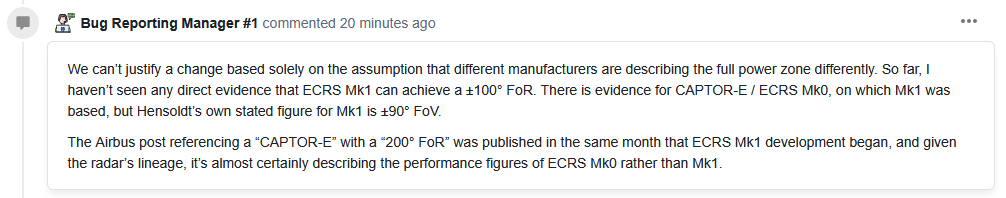 Which compares all 3 radars and critically does not state that the ECRS Mk.1 has a smaller FoR than the other 2 radars. FoR is shown for all 3 radars as being ±100deg, with ±90deg being the full power FoR. I might try to put in a third try bug report, but I doubt it’ll work. Gaijin just seems to be deadset on kicking German players while they’re down.