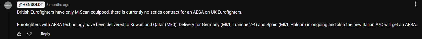 Lmao they think there is no AESA contract with UK eurofighters that’s hilarious 😂🤣🤣 meanwhile fgr4 zk335 with a mk2 installed and leonardo making the radars