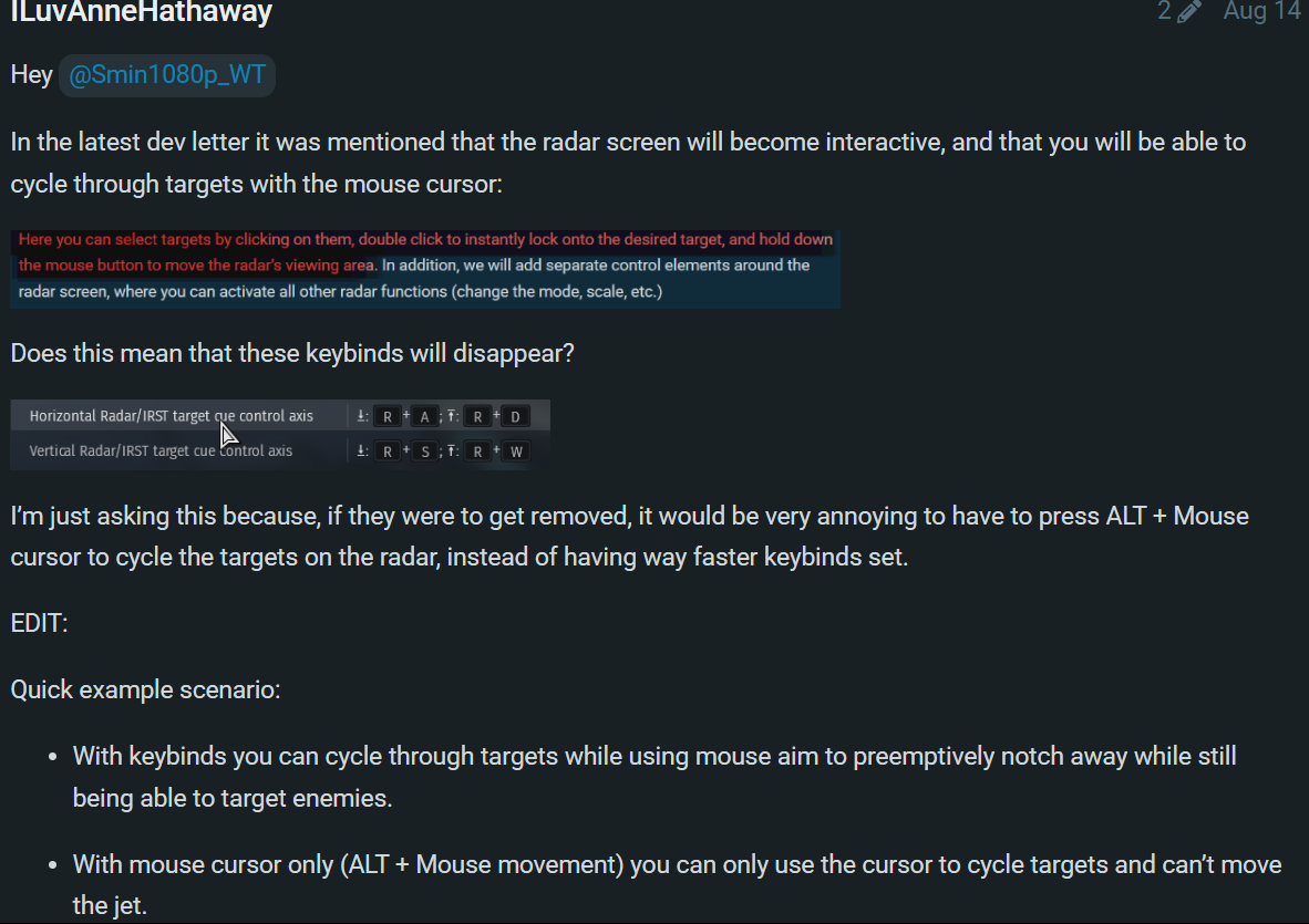 I thought that meant that since it becomes interactive the “radar target selector keybinds” were no longer gonna be there