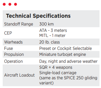 You have to fit the engine and the fuel tanks into that small frame without changing the dimensions of the missile/bomb body too much after all… Could that be a typo in the brochure? 200 km would sound way more realistic even if that’s still a very long range. Speed would also be interesting to know.