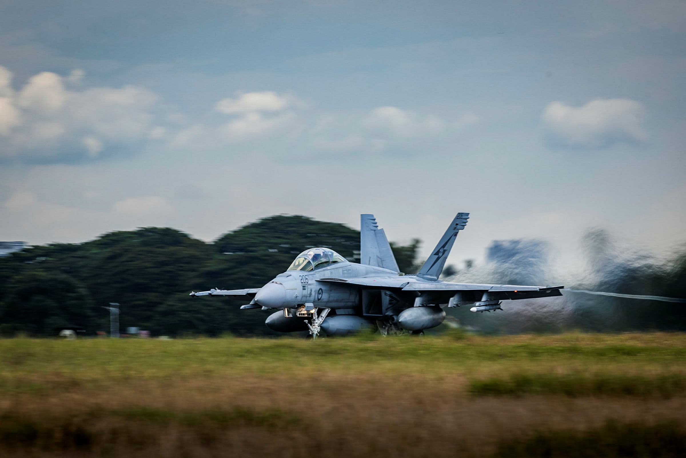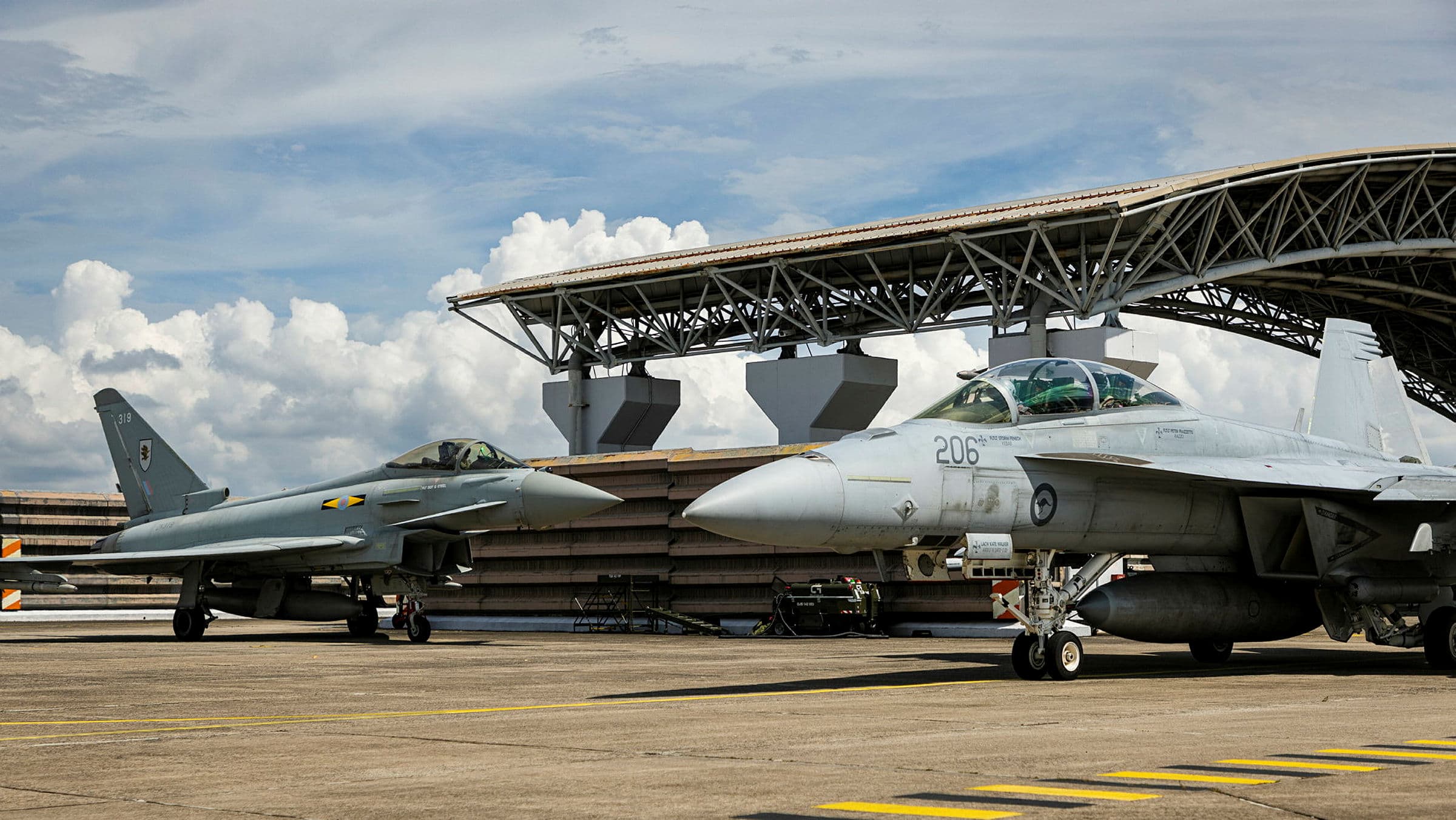 XI (F) Squadron RAF Typhoon at Royal Malaysian Air Force Base Butterworth with a Royal Australian Air Force F-18.