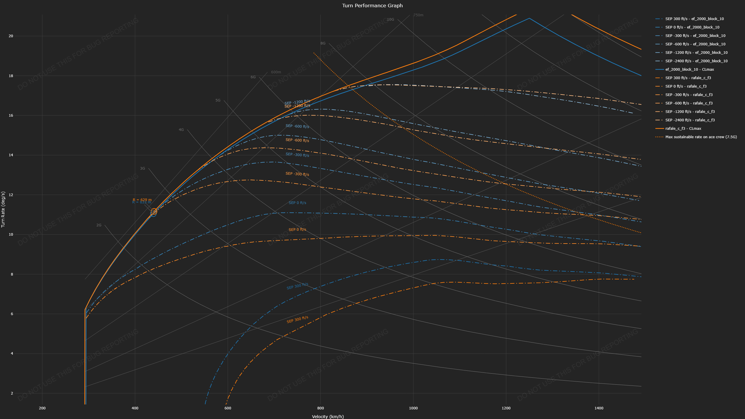 okay thanks you, I knew I was missing something. I was thinking of sea level charts. rafale at 11gs at high alt does indeed have better sep when pulling super hard. Altho, according to that graph, if you keep it to reasonable g load (so basically not full pulling/slamming s) eurofighter will keep more speed