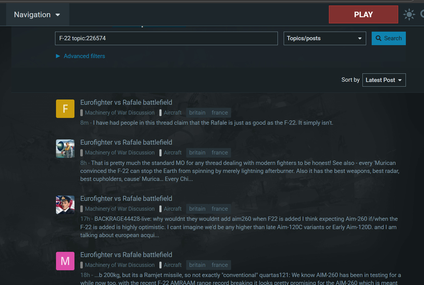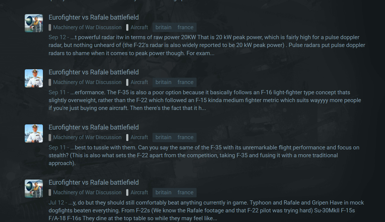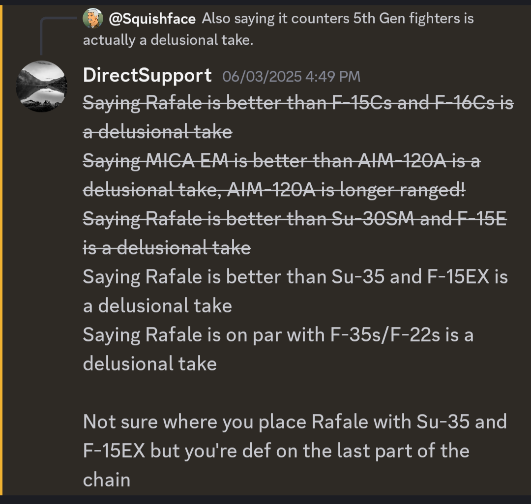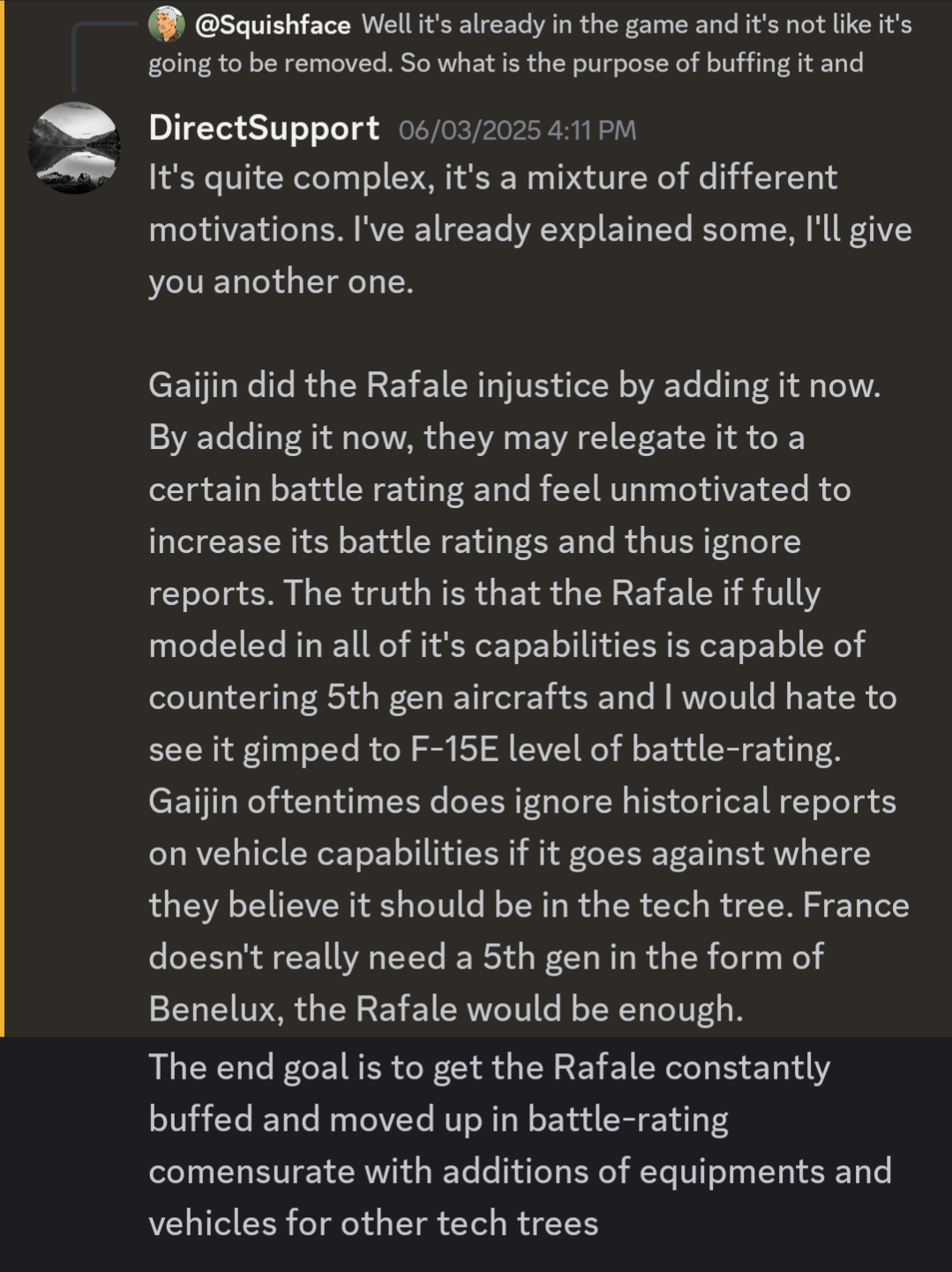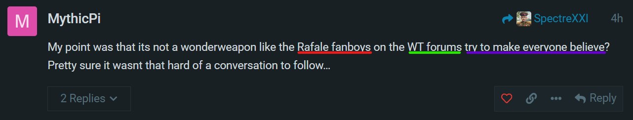 The conversation was not strictly regarding forum conversations, it was discussing the general tone and portrayal of the Rafale by Rafale fanboys which frequent the WT forums. Statements made using your own gamertag in other mediums such as reddit, discord, youtube, other forums, etc… also apply if/when found, as it is still a “Rafale fanboy that frequents the WT forums” “trying to make everyone believe the Rafale is some kind of wonderweapon”. Your assertion that it was a statement relegated to what has been said explicitly on WT forums is just you trying to deflect from an embarrassing situation of having your statements in other mediums brought up.