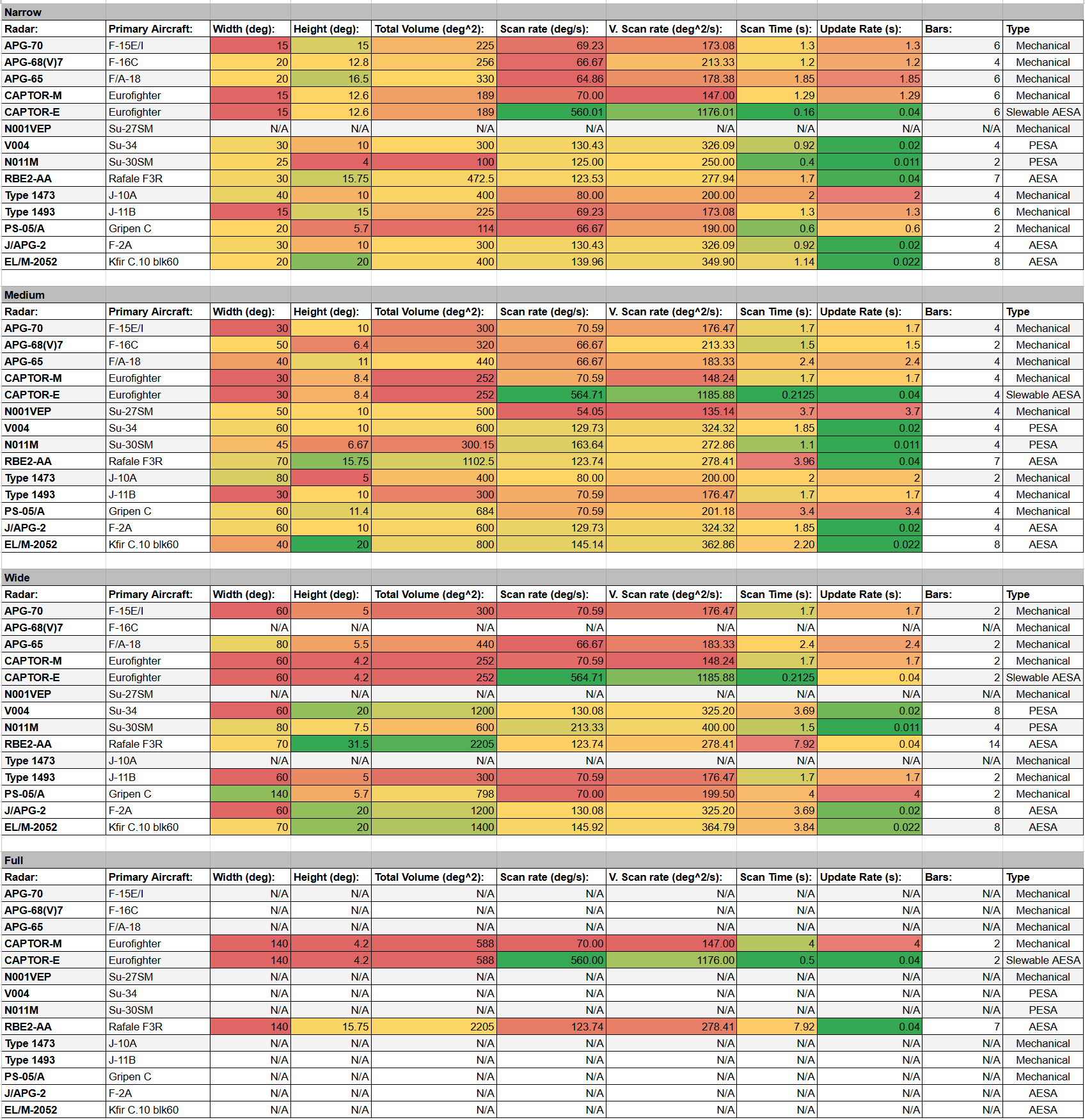 Radar spreadsheet with the absolute minimum we can expect from the CAPTOR-E when added to the game compared to most other top tier radars currently in-game:
