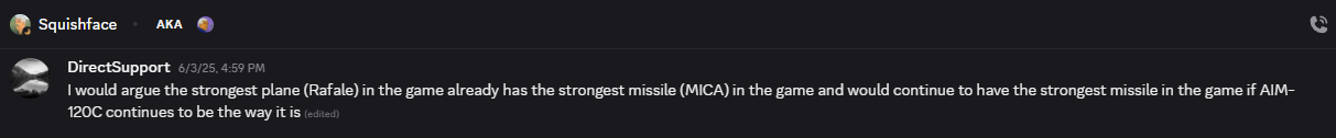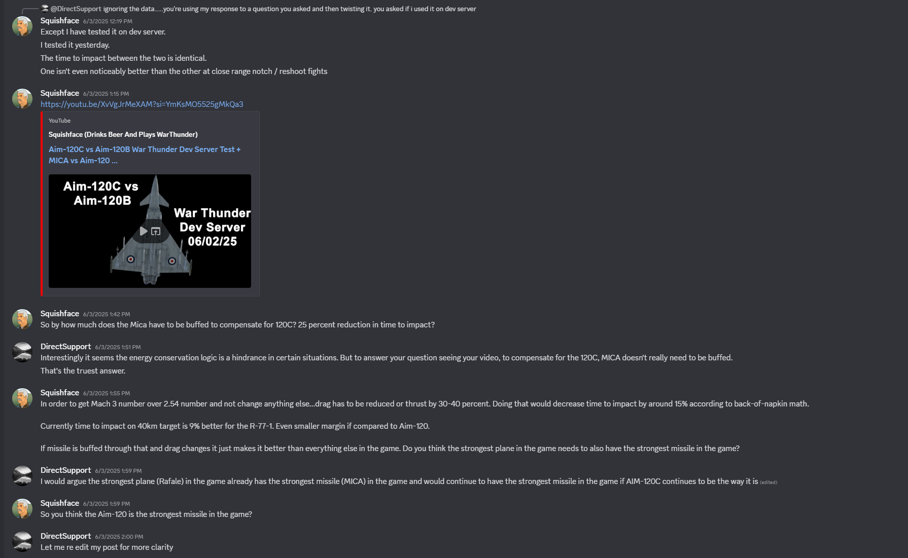 I had to practically drag you kicking and screaming to acknowledge that your initial assumption about the Aim-120C was entirely wrong. It wasn’t until I had made a video and thoroughly tested what a nothingburger the Aim-120C was on the dev server that you reluctantly agreed with me.