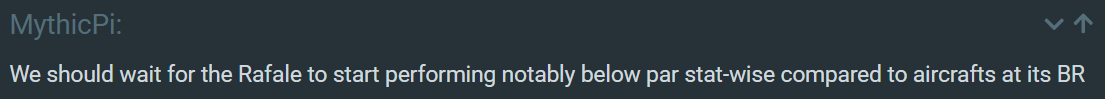 Now you may be going off-topic here. MythicPi stated that buffs to the Rafale should be put on hold until the Rafale is performing worse than vehicles at the same battle-rating.