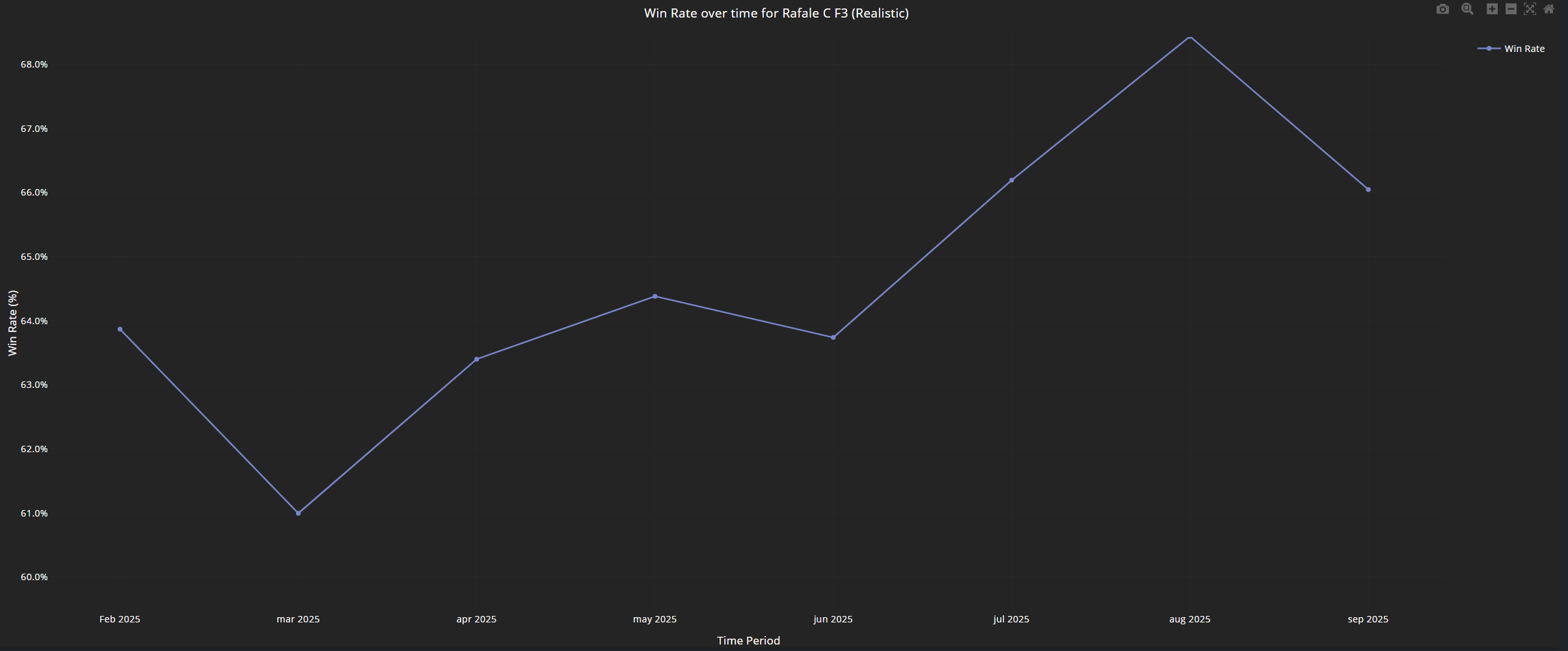 never below 60% though. Funny that. The most recent increases align with the points at which the aircraft was majorly buffed. If it were a set of “experienced players flocking in” you’d expect either a constant increase or a sharp increase followed by it remaining mostly static - instead it increases with each buff, and then slowly drops as other people learn to work around it being able to just walk in and beat every other aircraft to death.