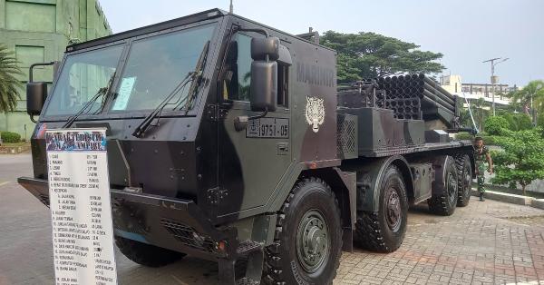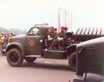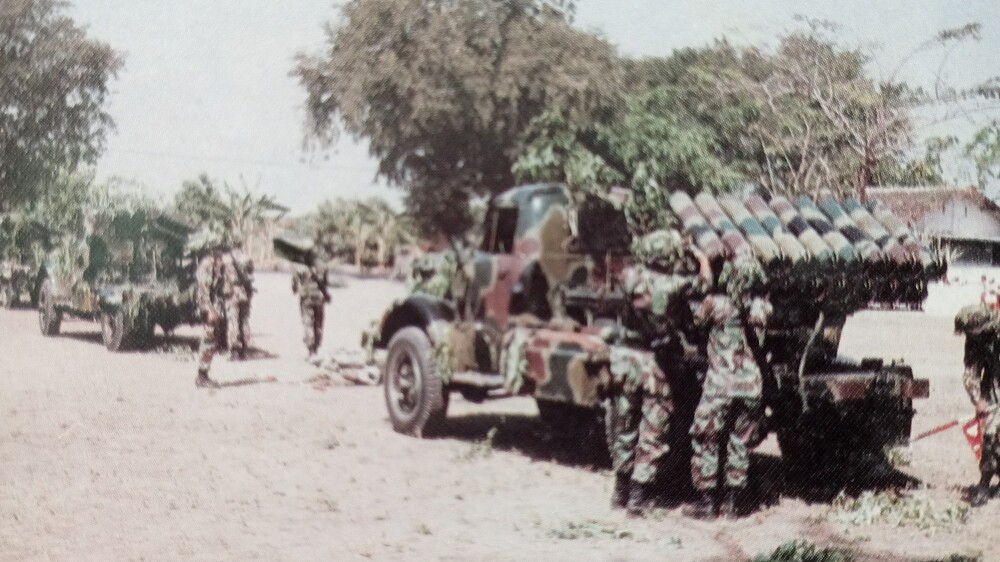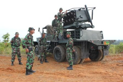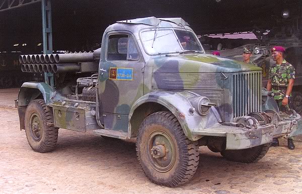Czechoslovakian 32x 130mm Rocket Launcher. The rocket launcher is mounted on a Praga V3S truck 6x6 truck. Used by the Indonesian Army from 1976 till recently. Was used in the Invasion of East Timor. HE rockets can hit targets up to 8.2km.