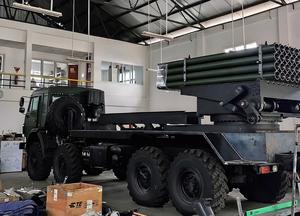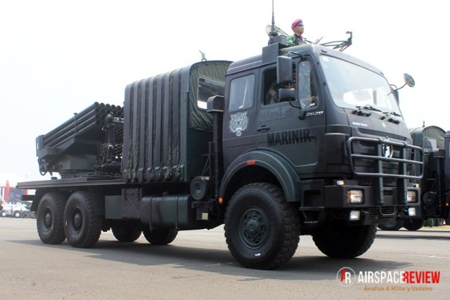 Indonesian PT-76B with the gun removed and turret modified to carry a BM 14/17 MLRS Launcher on top
