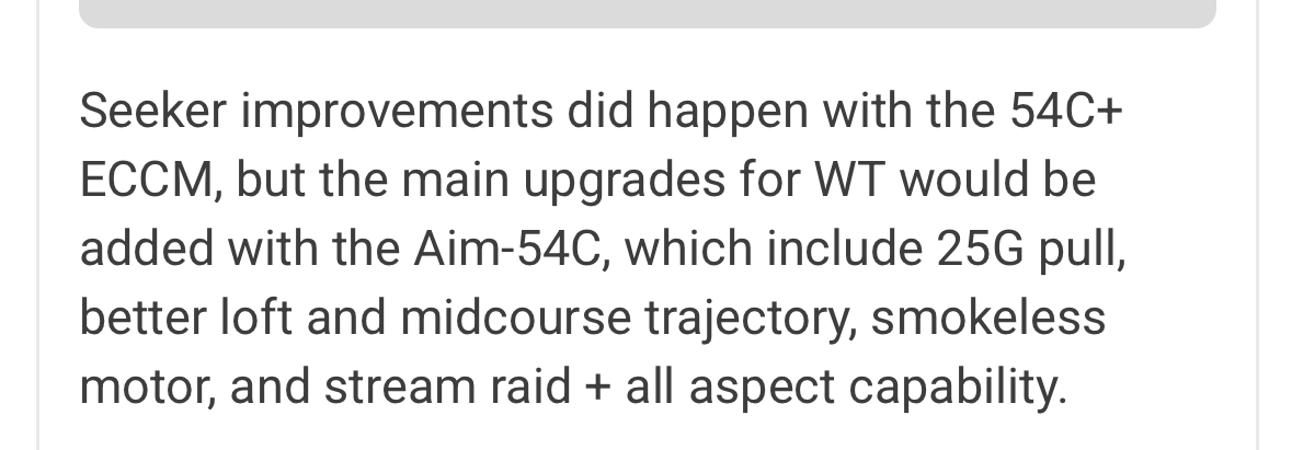 Seeker improvements did happen with the 54C+ ECCM, but the main upgrades for WT would be added with the Aim-54C, which include 25G pull, better loft and midcourse trajectory, smokeless motor, and stream raid + all aspect capability.
