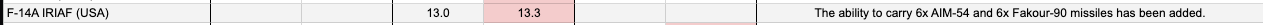 Its need a IRCCM if stay in 13.0 BR. Its standard weapon in this BR, And AIM-7P if it cant compare like R-27ER but it will help F-14 so much. And ACM of AWG-9 should be 19KM and have PD all aspect like another 13.0 jet.