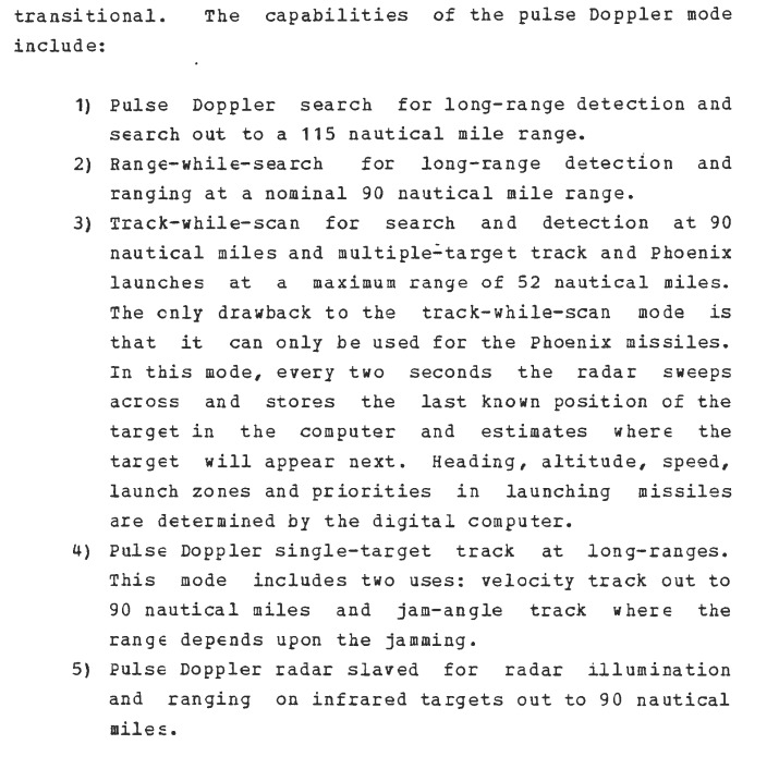 For the APG-71 to be tracking multiple targets at 192km in TWS is pretty good in my opinion… Even the APG-63(v3) from my limited researching only has 86nm of range for fighters in STT.