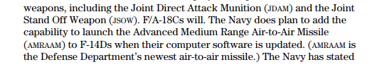 The same argument applies to the JDAM on the F-14B(U) because the VF-102 F-14Bs received data bus upgrades but never received the Sparrowhawk HUD or OFP 321 software required to handle JDAMs. Consequently, while their F-14Bs can physically carry JDAMs, they cannot use them.