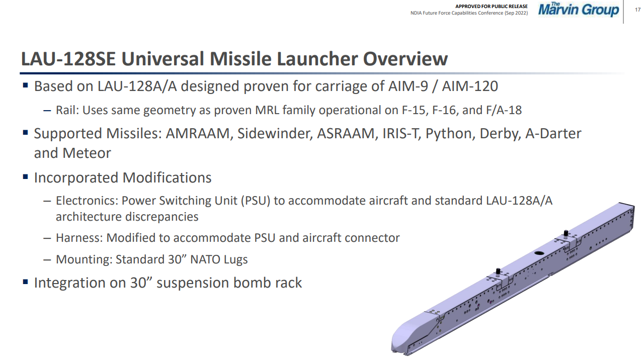 None the less though, LAU-127 simply isn’t cleared for F-16 because they have the F-16 specific LAU-129 instead that is built to universally mount on the wingtips and AAM stubs, and LAU-129 can’t be adapted for ADU-830 because the MIL-1760 socket is positioned in front of the mounting interface where it’s in the middle, or behind, on virtually anything else to balance them on a MAU/BRU type ejector.