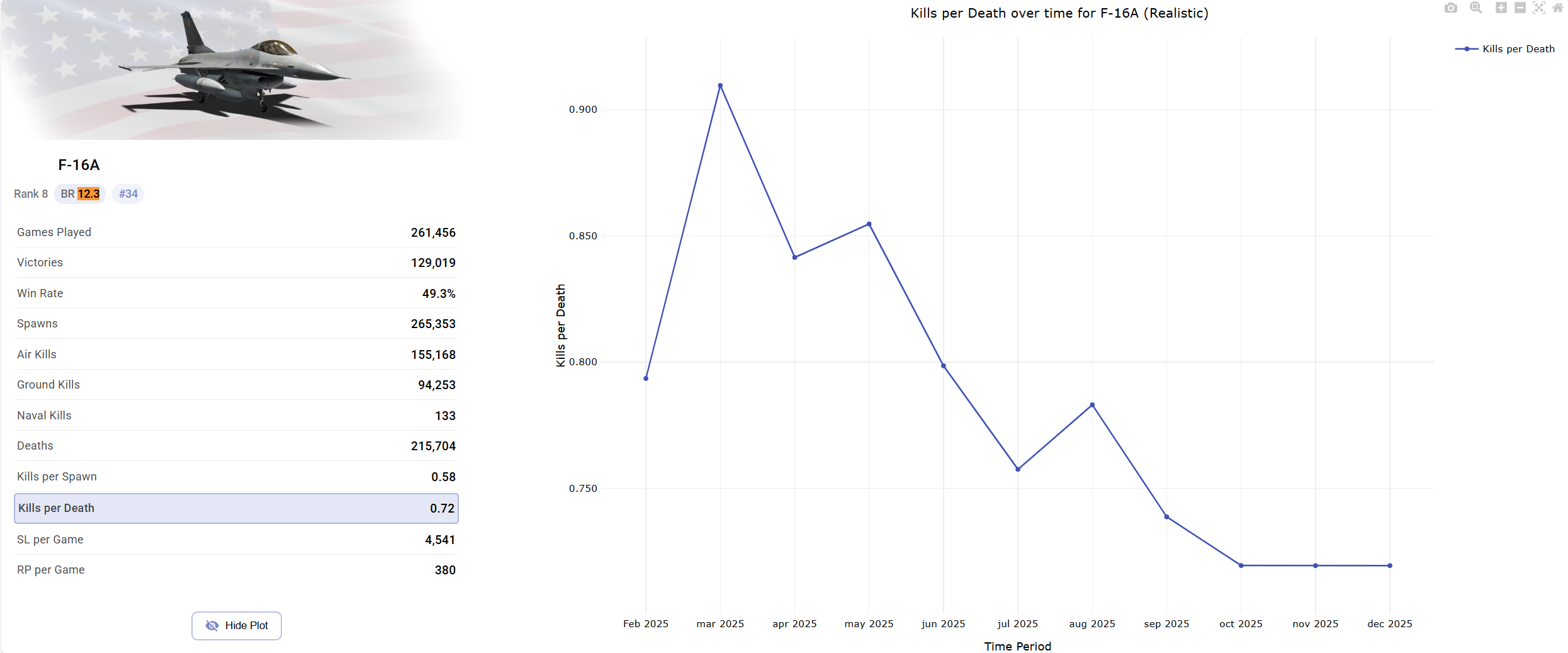 F-16A is perfectly able to act as “assasin”, jumping at lone planes and taking them out. Hell, at multiple occasions, I was able to dogfight multiple people. But the moment its spotted, its basically game over as now everyone will focus it and unlike, say, F/A-18A, it doesnt have Sparrows to put pressure onto the attacker. If my position wasnt broadcasted live to the entiriety of the enemy team, Id be much more succesfull in F-16A.