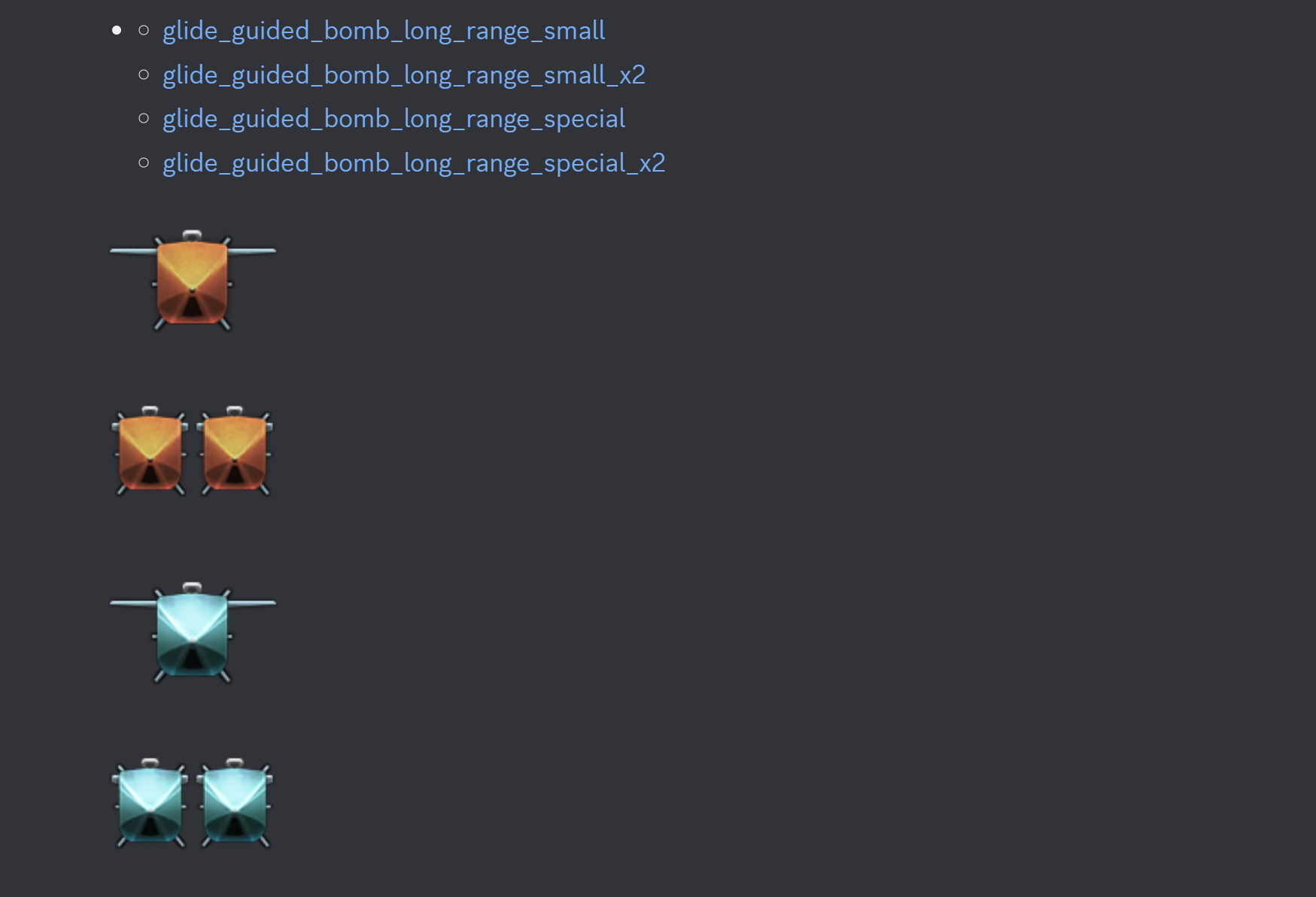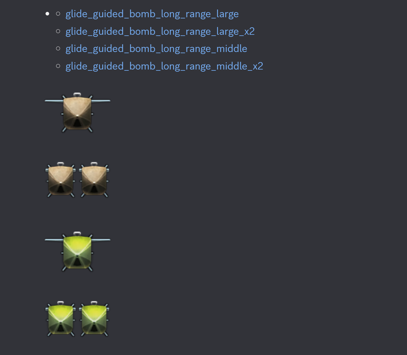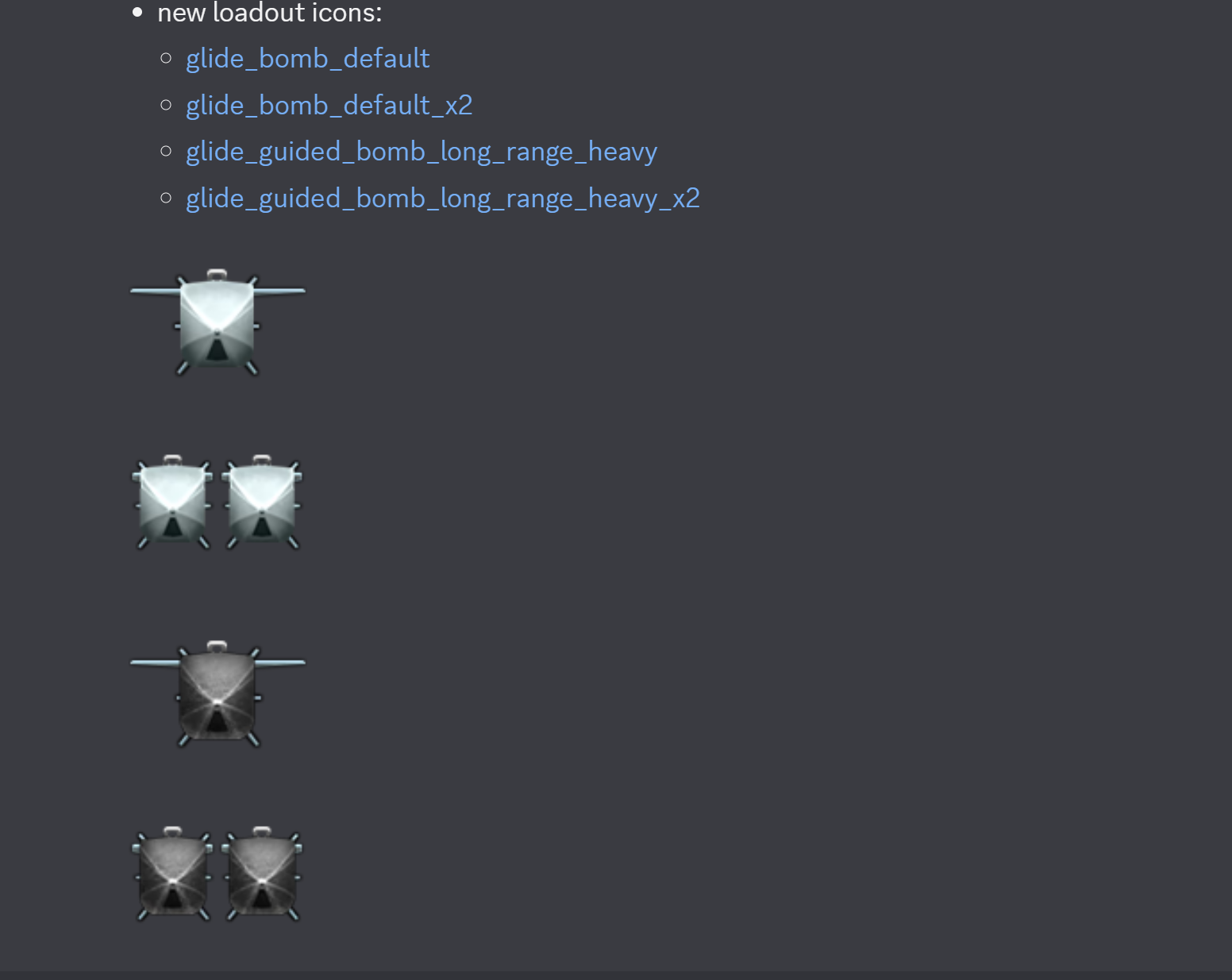 Generic glide bomb icons, we got 250, 500, 1000, and 2000lb, 250kg 500kg, 1500, weight class so far, of course some of these would be lumped in.