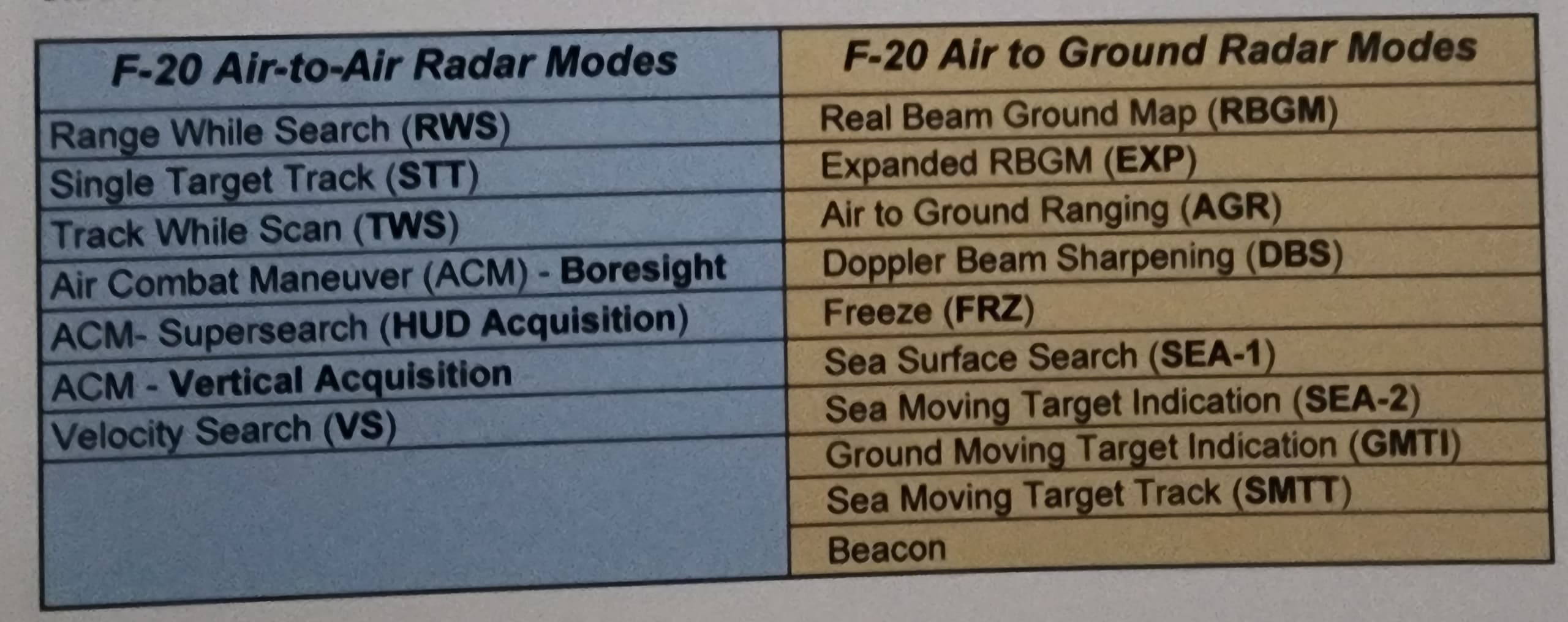 It looks to have been an actual radar mode, used for navigation while flying at low levels (to avoid any other aircraft picking up the F-20’s radar signature)
