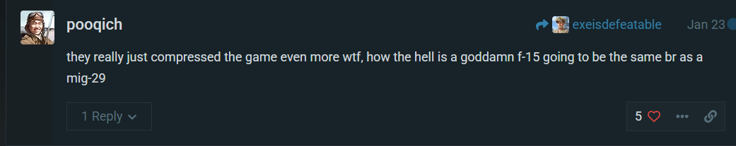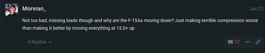 Giving new players more Fox-3s is also bad as it reduces the quality of teams even more than they already are (<5 minute-long games are already common due to people just not knowing how to avoid the first missile launched at them) and will also result in the F-2’s popularity increasing, creating a bigger BR black hole for 12.7 planes to get sucked into.