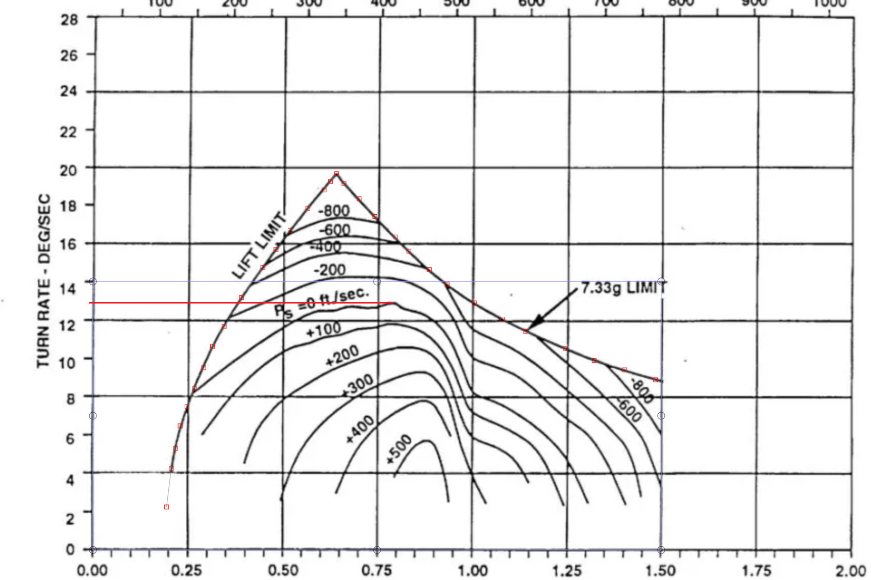 Note how I have down a red line at maximum SEP = 0 / STR and it shows that it is 13 degrees per second in this chart. This chart is present in a NASA study and does not specify any kind of missiles or loaded weight; in fact the fully document mentions testing the program being developed on the F-18 HARV.