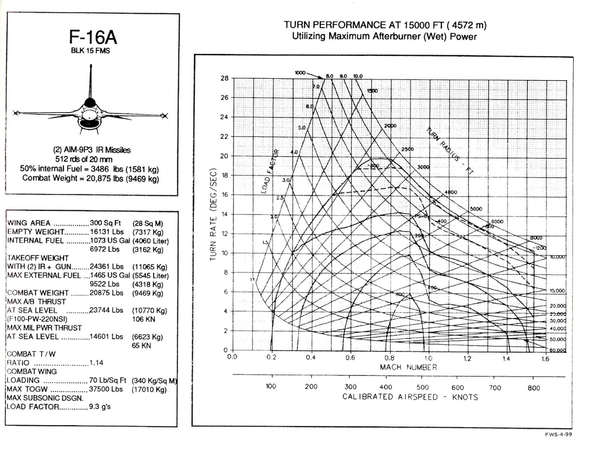 Yes, I found a chart for the F-16C (Yes I know it weighs more, however its aerodynamically the same and when the F-16C is at 22,000 lbs and the F-16A is weighted up to 22,000 lbs they will perform the same)