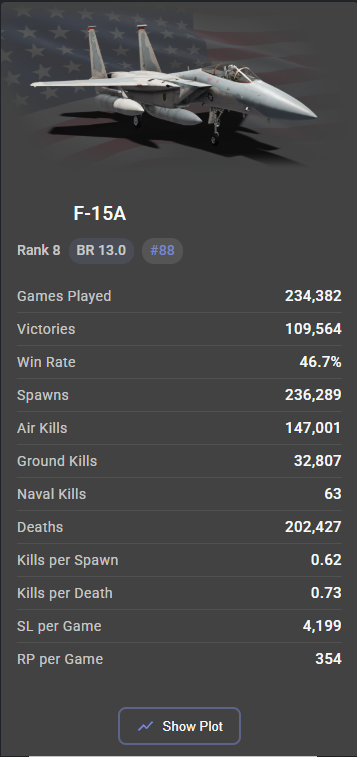 F-15A gets to farm those same premiums, with the same Sparrow Tomcat does. By all accounts if it wasnt for Phoenixes, F-15A would clearly be the better plane. So why its KD is significantly worse than 14B?