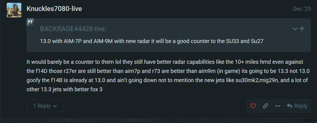 Like I said everyone knew those planes where gonna be beast it’s not that hard to comprehend great missiles load out and good fm with good radar simply understanding that they gonna have a good advantage against most 13.0 planes. the f15A suffering is just in the same boat with f14B I’m not denying that witch is why most people try get the reworks for vehicles most people want to see not vehicles be artificially nerfed/model wrong