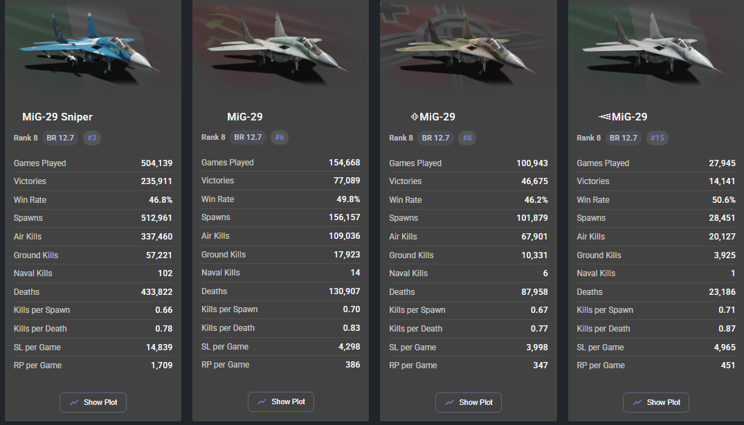 (Now THIS, this may truly be a skill issue, because as I have already pointed out, the 12.7 USSR Mig-29 has 15 million spawns, 52.4% win rate, 1.18 K/D)