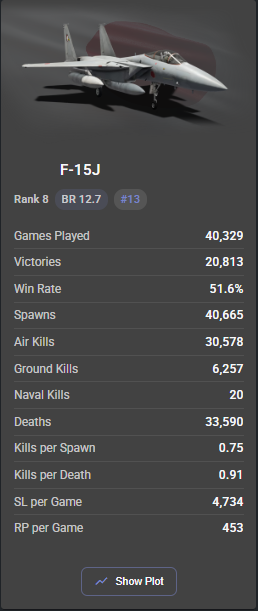 Some people here would get easily triggered if we check the all-time stats of, for instance, the South African Gripen C and how broken it was when it fought 13.0s prior to the fox-3 meta, so much that it still carries a good historical KpD, still a whole tenth above its most recent performance.