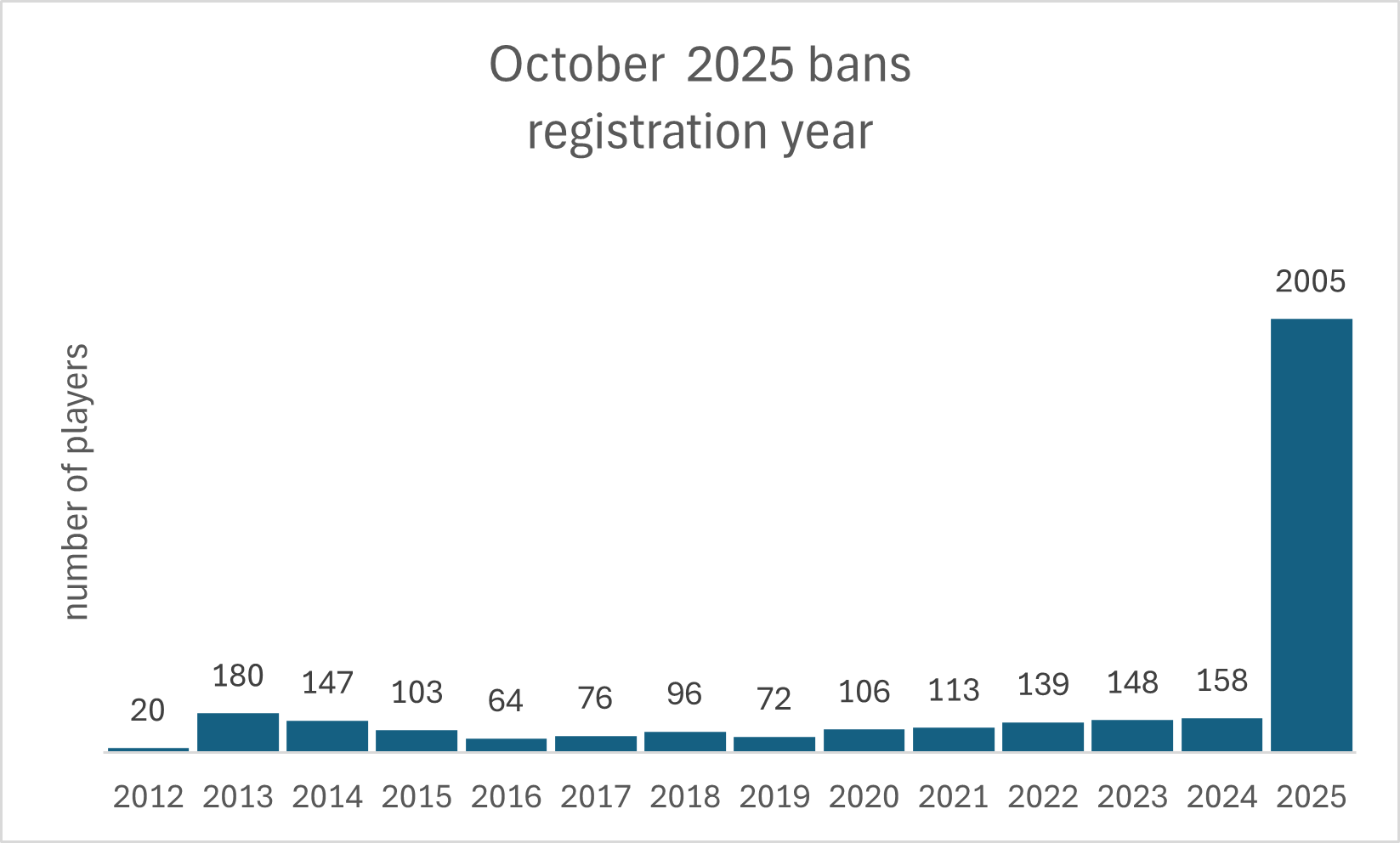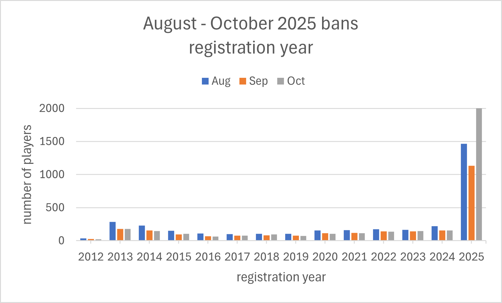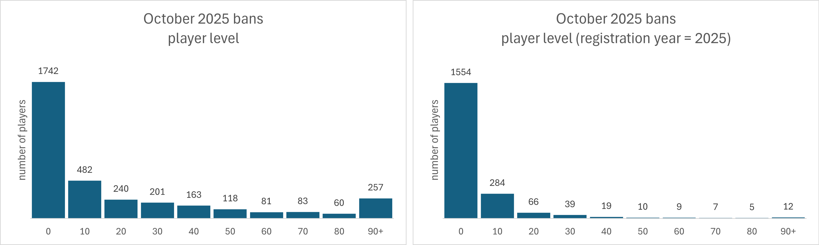 Since our last fair play, we’ve banned 3520 accounts that were found to have violated the rules. Specifically 3.2.3 of the EULA namely in the automation of gameplay (using bots) and cheat software. For complete transparency, we’re publishing the full list of these banned players. This list will be available for two weeks after the publication of this article.