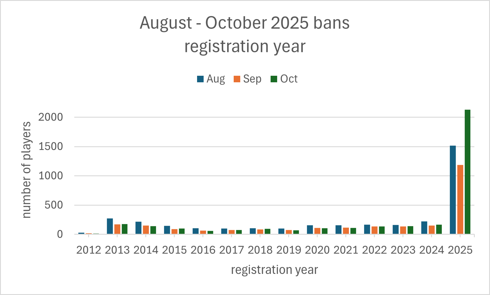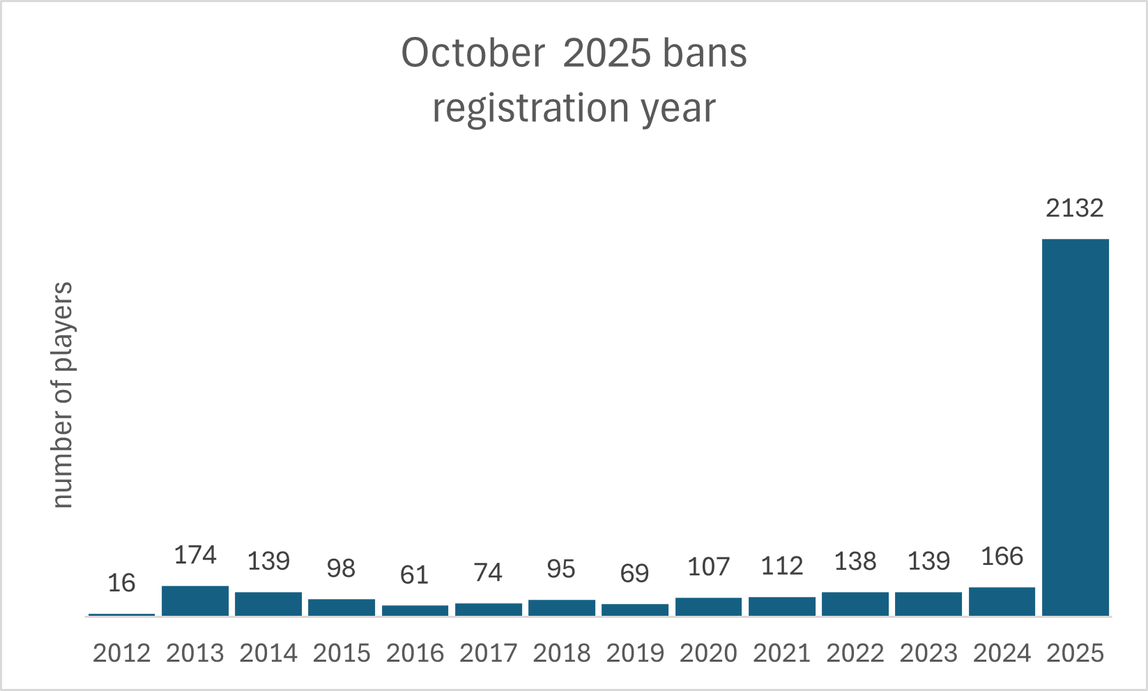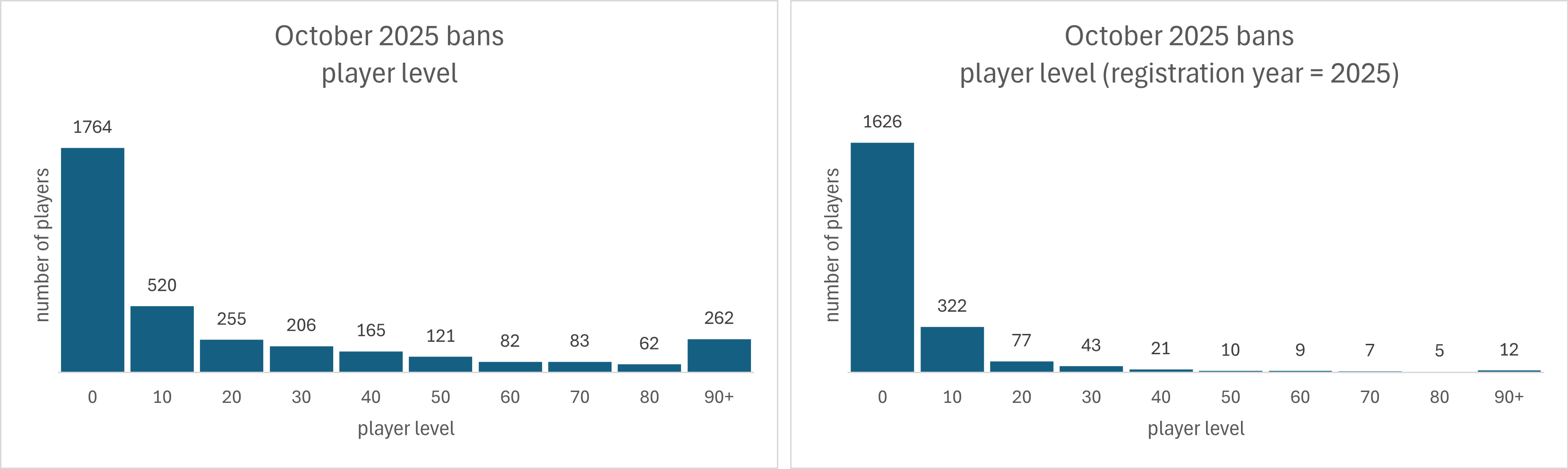 Got bored, here’s some stats from these bans. Hope I’m not abusing the transparency too much.