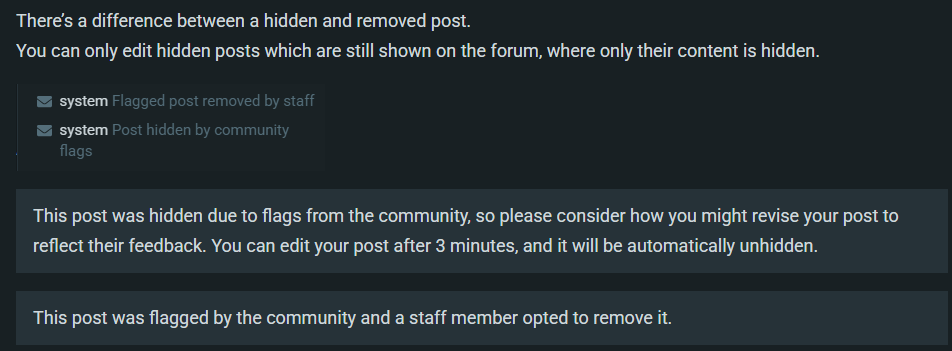 If your statements weren’t against the rules (often insulting other players), they wouldn’t get reported and removed. If you were confident they weren’t against the rules, you’d simply edit them. If they were removed again, moderators could easily wave the removal.