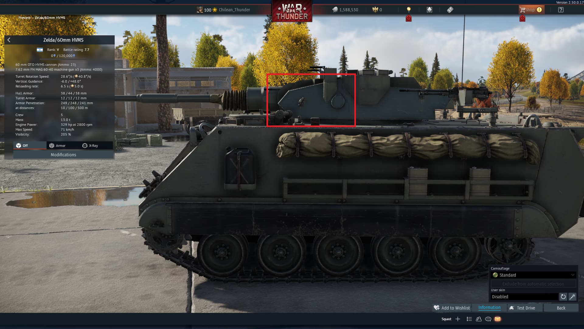 It is also worth mentioning that there were 2 different types of turrets, these being the early version (the one used in the game on the M113 HVMS) and the late one that was installed in the Chilean FAMAE Piranha 6x6, they can be differentiated in that the turret of the late version is arrow-shaped and more angled from the front, while the early version’s shape is not as angled and is straighter from the front, they also differ in the optics of the commander and the gunner, these being larger in the early version and smaller in the late version. The late turret installed in the Chilean Piranha also has some extra accessories such as the two sextuple smoke launchers and the pivot for the machine gun operated by the commander.