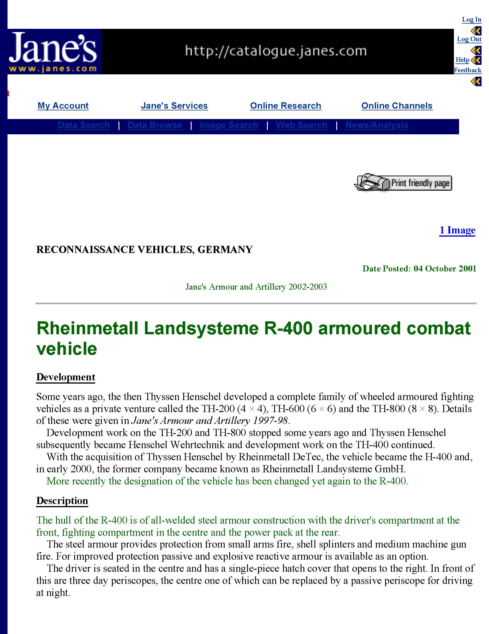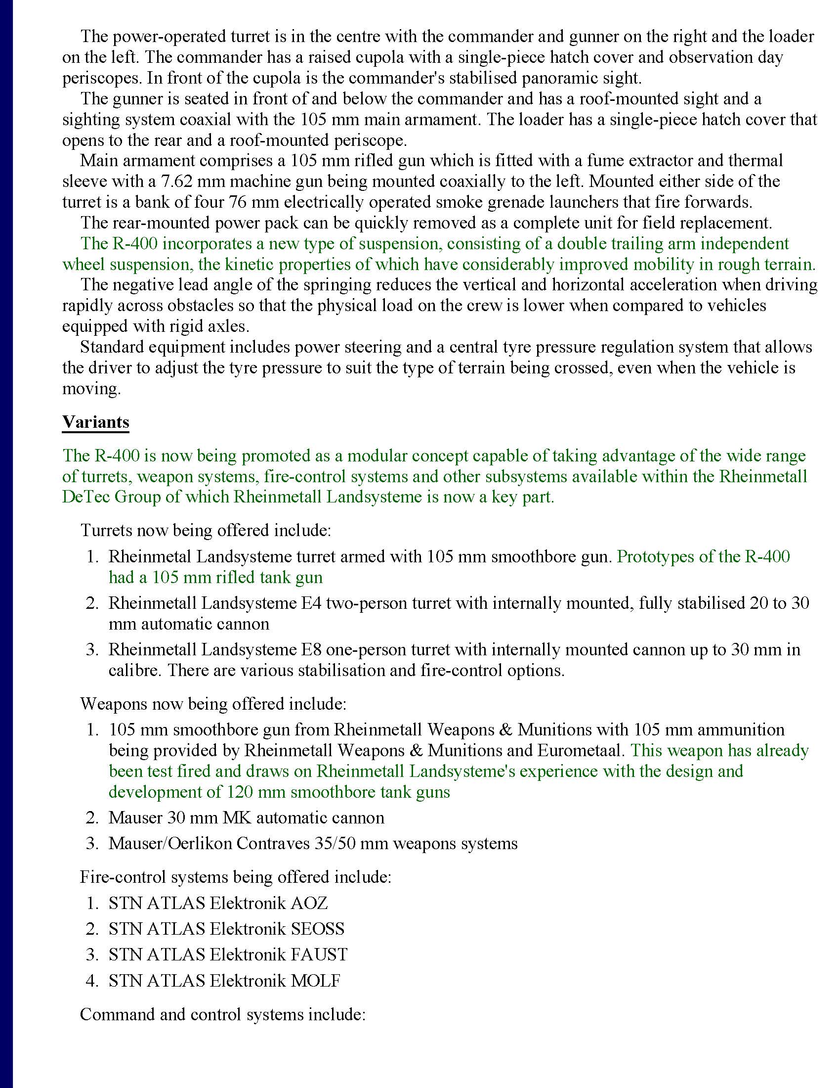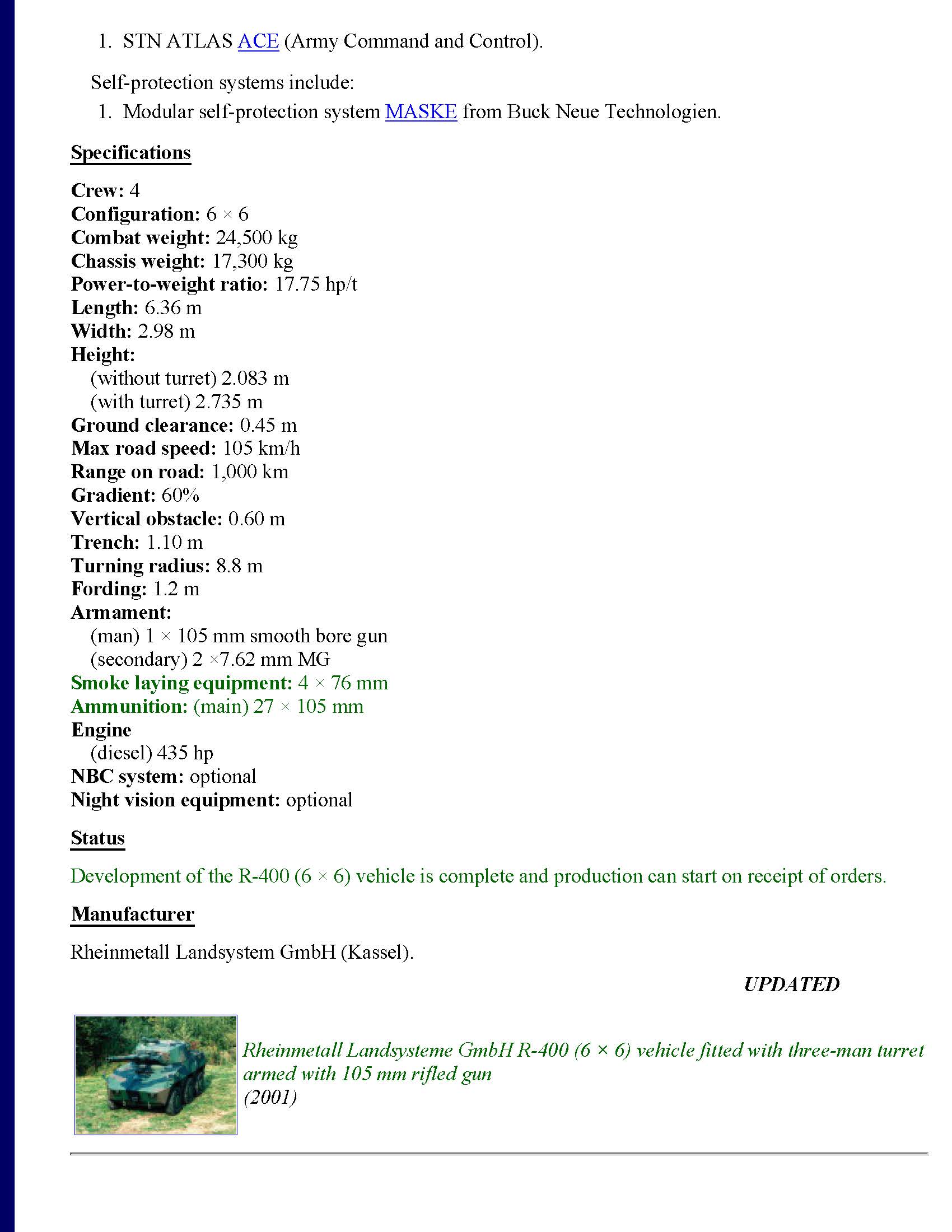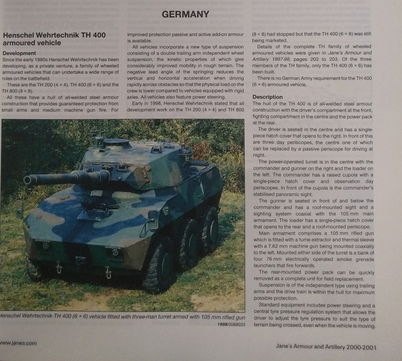 It was shown at EUROSATORY 2000 under the designation “H 400” (H refering to HENSCHEL Wehrtechnik, a subdivision) and was later renamed to R 400 at some point in 2001.