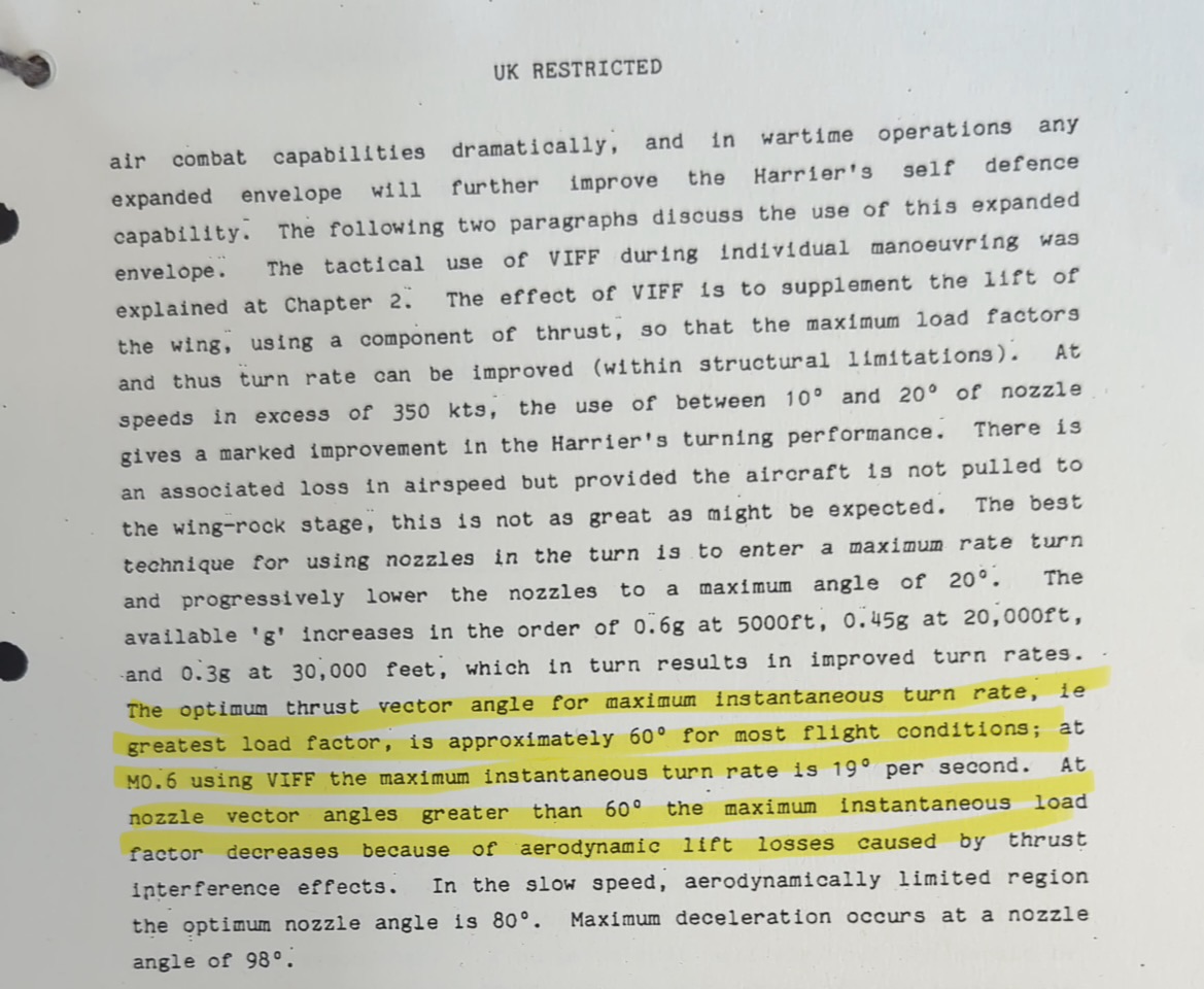 The use of 60 degrees nozzle angle IRL will give an instantaneous turn rate of 19 degrees per second at .6 mach. With approximately 13 degrees AOA.