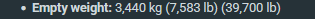 - Maximum loaded weight: 4,337 kg (9,561 lb)