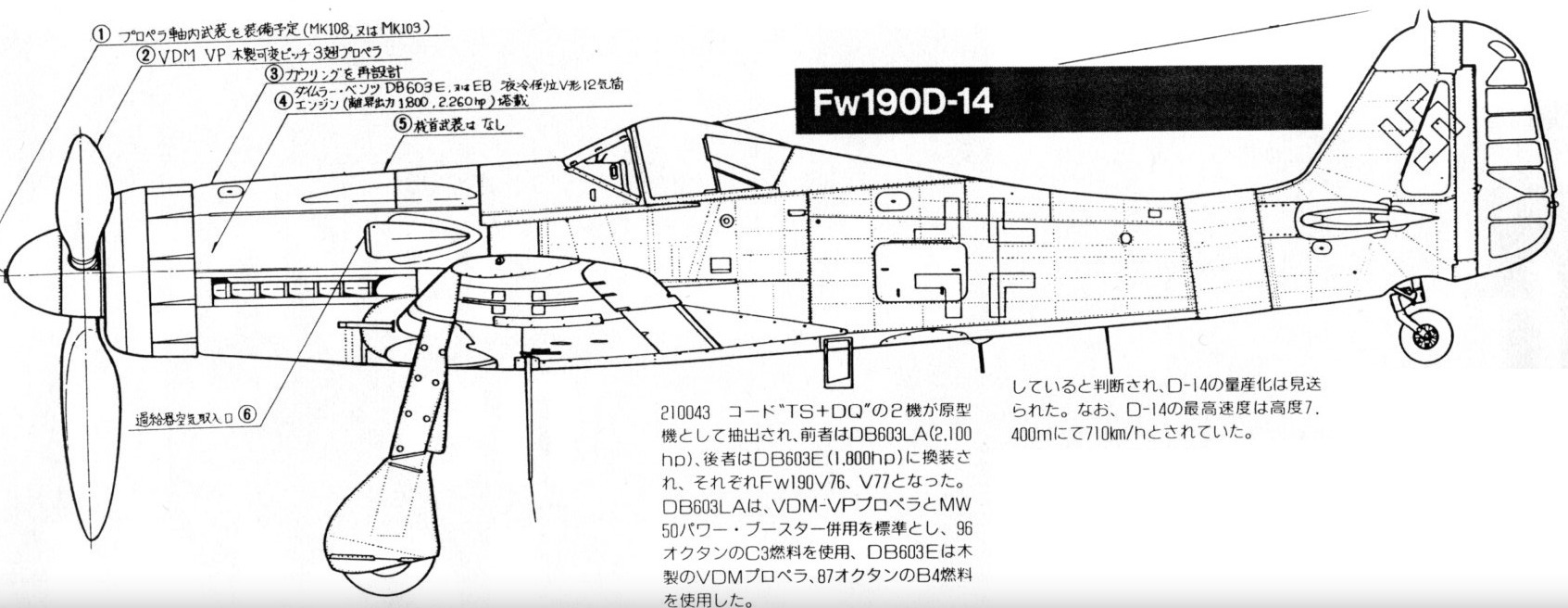 The Fw 190 D-14 was one of the final planned high-performance evolutions of the Focke-Wulf Fw 190 “Dora” (Langnasen) family during late 1944–early 1945. It aimed to install the more powerful Daimler-Benz DB 603 inverted V-12 engine (instead of the Jumo 213 series used in production D-9 through D-13 variants) to improve high-altitude performance, speed, and overall capability against high-flying Allied bombers and escort fighters. The project ran parallel to similar efforts but was quickly superseded.Development Background and TimelineBy mid-1944, the Luftwaffe urgently needed better high-altitude fighters. The standard Fw 190 D-9 (Jumo 213A) performed well at medium altitudes but struggled higher up. The D-11/D-12/D-13 introduced the improved Jumo 213F/E with MW 50 boost and heavier armament options (e.g., MK 108 or MG 151/20 cannon layouts). The D-14 represented the next logical step: swapping to the DB 603 family, which offered superior power at altitude (around 1,750 hp base, with variants like DB 603E/EB/LA reaching higher outputs via injection systems or supercharging).