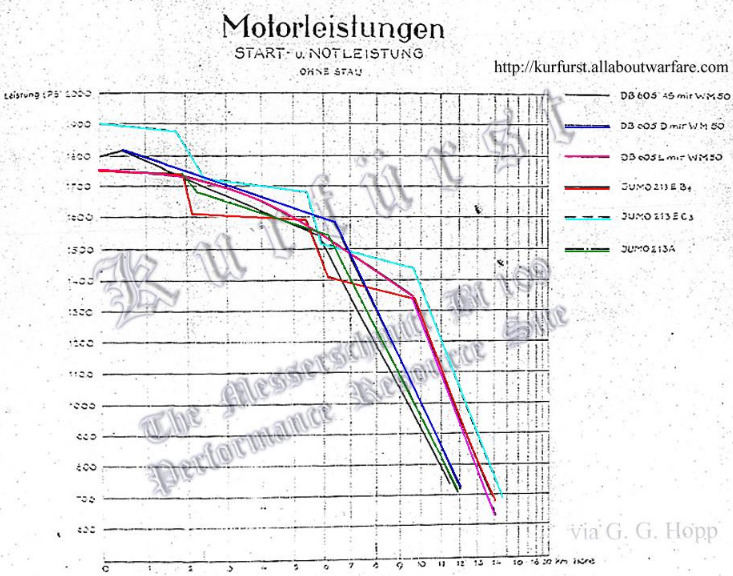 I have viewed a chart that lists a similar power setting with a Ladergang which I believe is a special low altitude compressor gear. This appears to be an additional engine/compressor modification. I have no idea how many aircraft actually had this “power egg” or blower gear but the chart lists it’s use. I have speculated that the Dora “Red 13” of JV44 may have had one of these engines/ compressors. I do not have a engine power curve for this setting but based on the numbers it must have produced a significantly higher power than 2100PS at low altitude. This may be the 2240PS power setting?