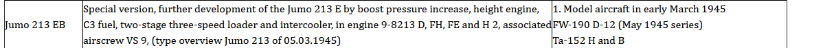 Jumo 213F (two stage non intercooled 3 speed supercharger) and interim version for the fw 190D13 Used on Fw 190D13. I believe had higher Compression Ratio but required C3 fuel to achieve same power as Jumo 213E1 due to minimal intercooling.