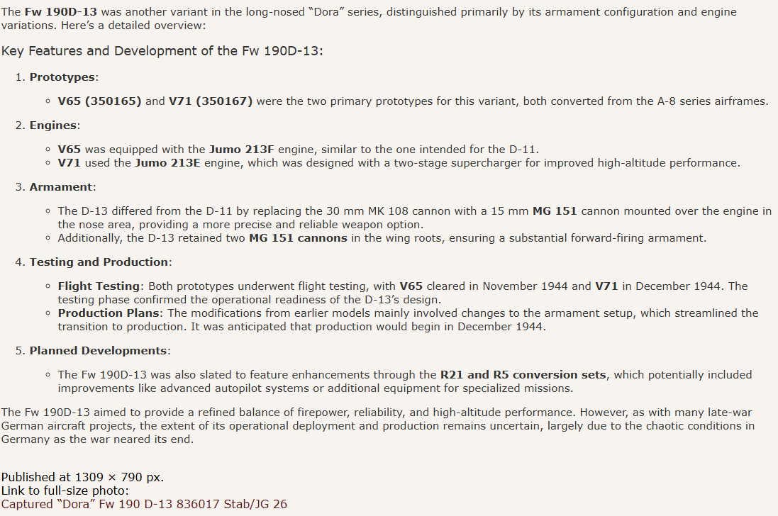 The D-9’s that the U.S.A. and England had in it’s possession were reportedly equipped with additional boosting systems (MW-50, etc.) but detailed performance analysis has eluded me from these sources. Interestingly, the D-13 that the US had in their possession had MW-50 and GM-1. I do not know is the U.S.A. did any flight tests with the D-13 but flights of some extant, with at least 3 or 4 Fw190D-9’s, has been refered to in various literature and documents. The flight testing done by the British included the use some of additional boosting systems and give a completely different view, compared to U.S.A. testing, of this fine aircraft.