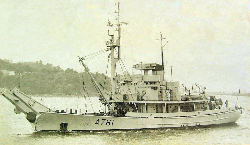 The Criquet was commissioned into the French Navy in 1955 and performed various support tasks for the Atlantic Fleet, which was then undergoing reconstruction. These tasks included recovering training equipment used by the fleet (mines, torpedoes, nets), but it also served other purposes, notably laying a submarine cable between France and the Netherlands. Transferred to Toulon as part of the Mediterranean Fleet, the Criquet saw significant service during the Suez Crisis, providing transport and logistical support for French troops. It even made several trips to the Indian Ocean to retrieve nets and moorings.