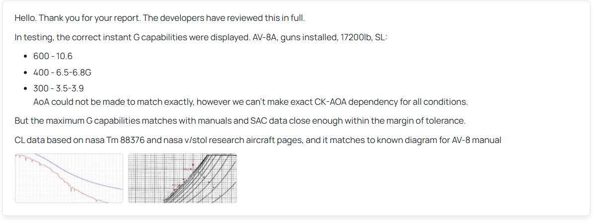 “The Harrier 1s lift is incorrect as discussed in a previous report. The devs denied this report with a gross misunderstanding of their own sources. NASA ™ 88376 is a source they quoted. This source contains a chart plotted Coefficient of lift. What the devs failed to do was read any of the other sections of the report, in particular the section that says that all data was normalized to approximately fall between 0 and 1. The highest coefficient of lift actually seen on the wind tunnel data was 1.46 but was normalized from 0 to 1 to fit on NASAs plot. Gaijin never read this and assumed the coefficient of lift was just less than 1.”