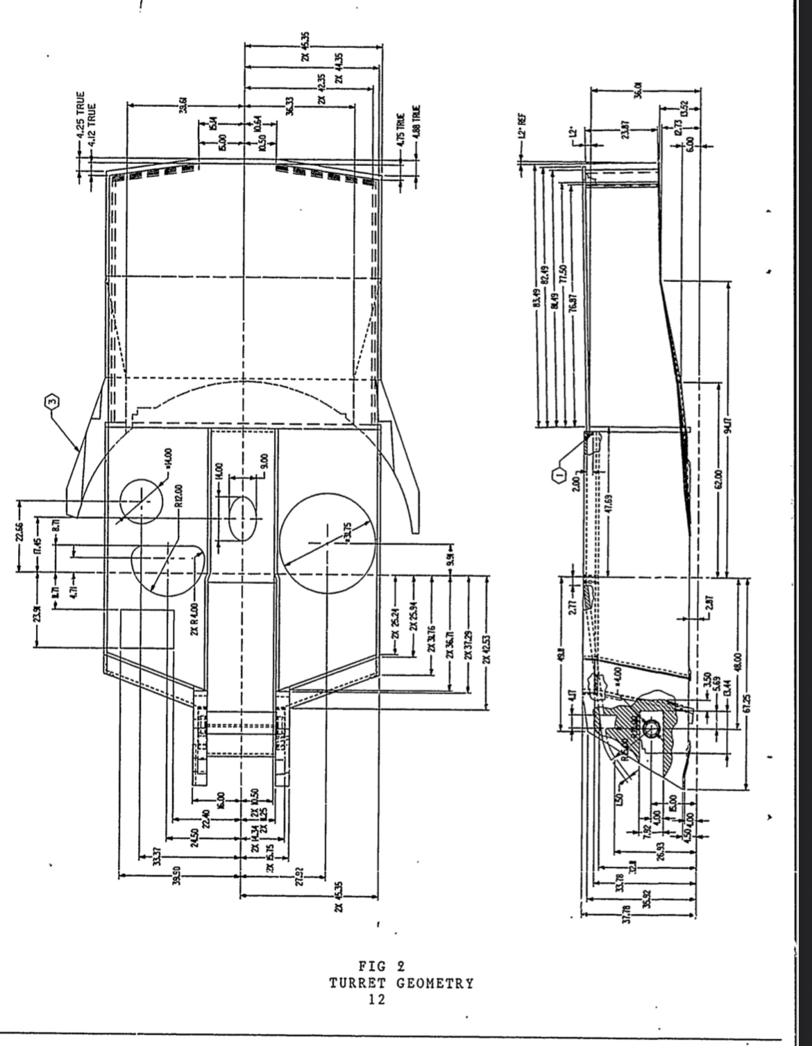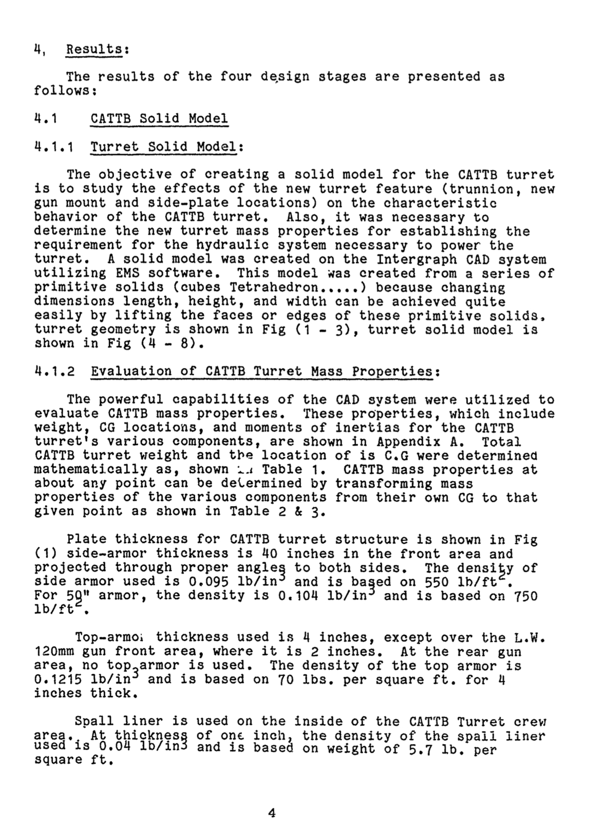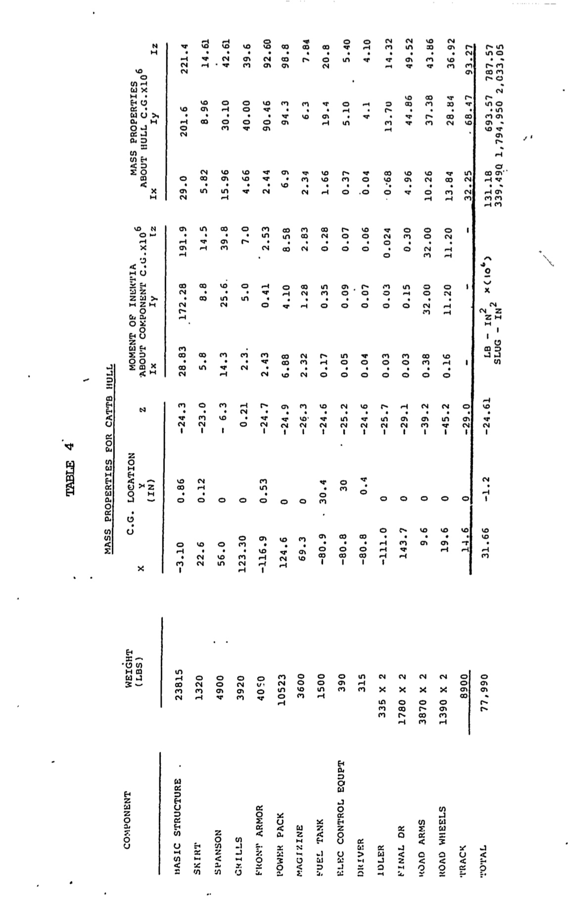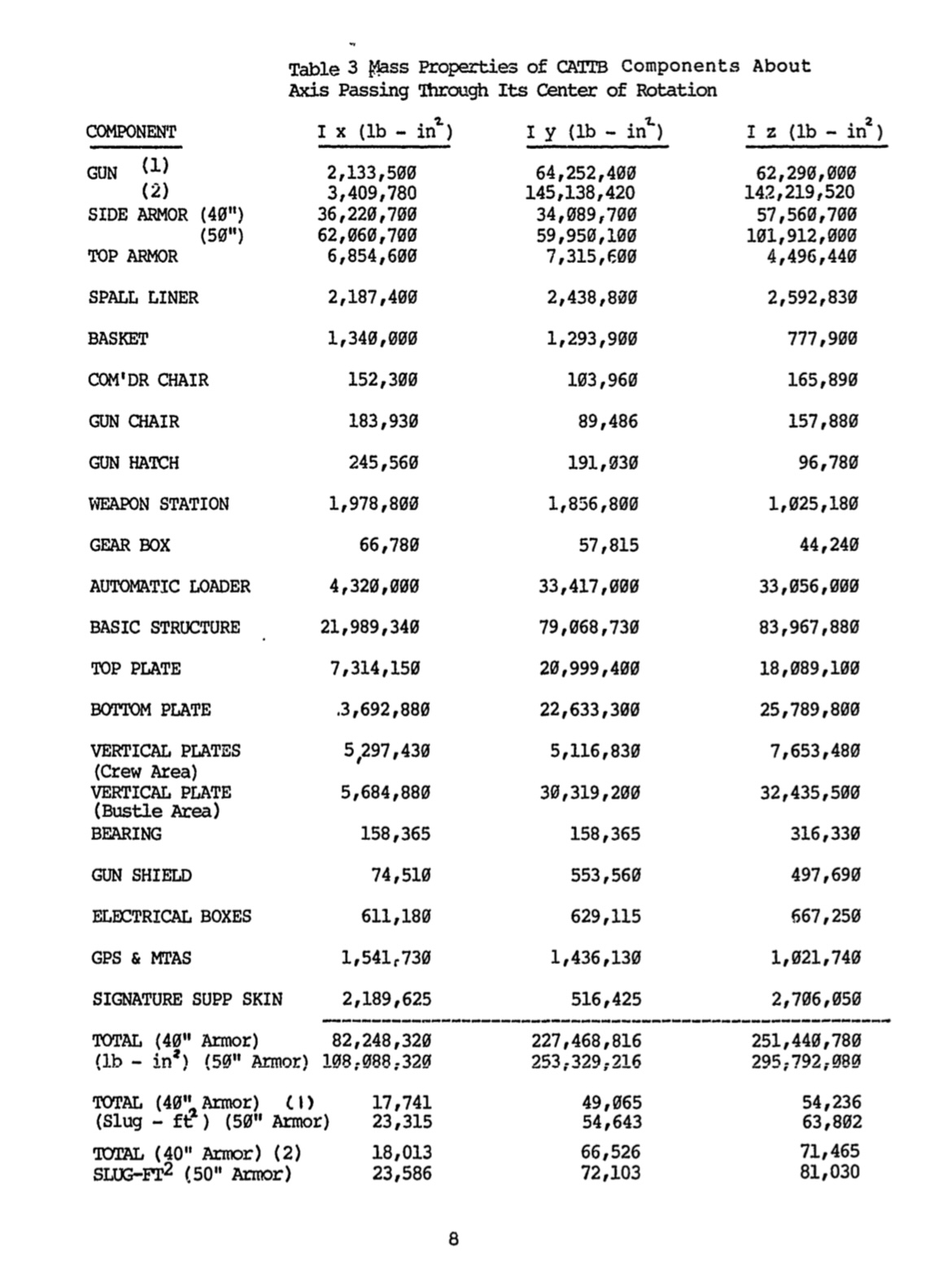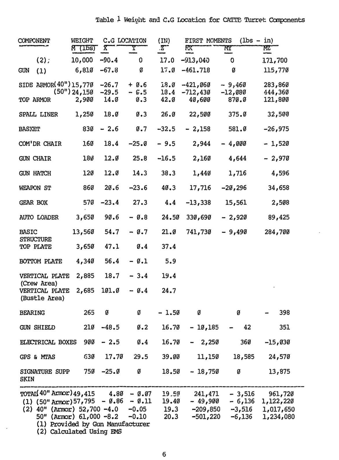 These pages appear to be weight and stuff to do with inertia. Based on these pages of information, the hull of CATTB weighed about 78,000 lbs (39 tons), according to table 4. For the pages for CATTB turret (Tables 1, 2, and 3), it has 2 different gun options when talking about weight and Moment of Inertia ( Ix(lb-in^2). I assume Gun (1) is the 120mm version of XM291, and Gun (2) is 140mm version of XM291, based on the different weights. Now this leads me to a slight hiccup, which is what the side armor thickness value refers to. There appears to be 2 different values, I’m not sure if there are 2 armor packages I’m not aware of, but what the side armor actually is (in terms of placement on the turret) can be found in the “Dimensions” section on figure 3 and page 4. Regardless, the minimum armor value stated for the “side armor” of the CATTB turret, is 40”, or 1016mm (with 50” being 1270mm). At the bottom of table 1, it shows 2 different weight values for both armor packages, with (1) being the values provided by the Gun manufacturer, and (2) being the values calculated using EMS (unsure of what this stands for). If we use the manufacturers weight, the turret appears to be 49,415lbs (about 25 tons) at 40”, and 57,795lbs (about 29 tons) at 50”. Using EMS, this puts the weight of the turret at 52,700lbs (about 26 tons) at 40”, and 61,000lbs (about 31 tons) at 50”.
