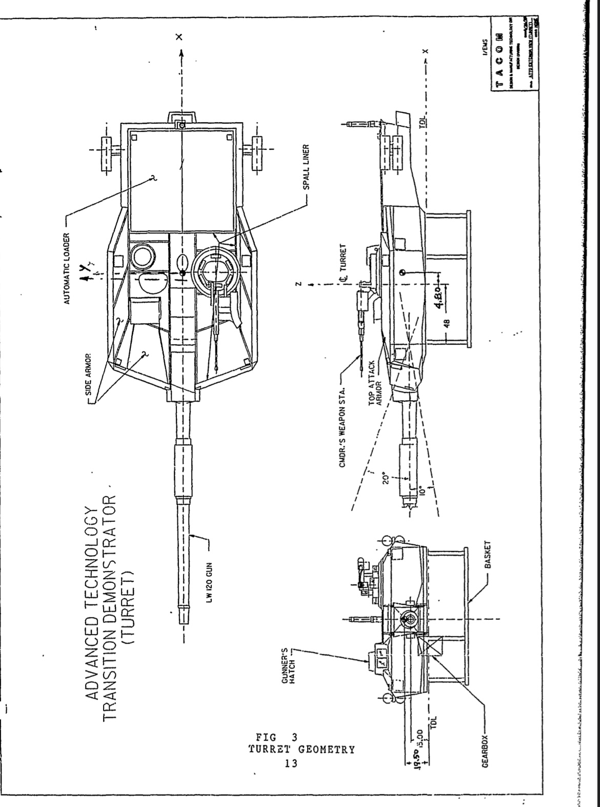 These pages have to do with dimensions of the turret (note: the turrets appear to be mounted with the 120mm gun, I don’t know what LW stands for, but there was a 120mm version of the XM291). Also note that spall liners are pointed out. Figures 1 and 2 appear to be mounted without the additional armor, with figure 1 showing that the base armor is around 1 inch thick almost all around. Figure 2 looks like it shows the dimensions of the base armor. Figure 3 seems to show the CATTB turret with its add on armor equipped, plus it also shows the turret basket and gearbox for I assume turret controls? Also shows gunner and commander positions, spall liner locations, and by the looks of it, CATTB armed with the 120mm, has about 20° elevation and 10° depression?