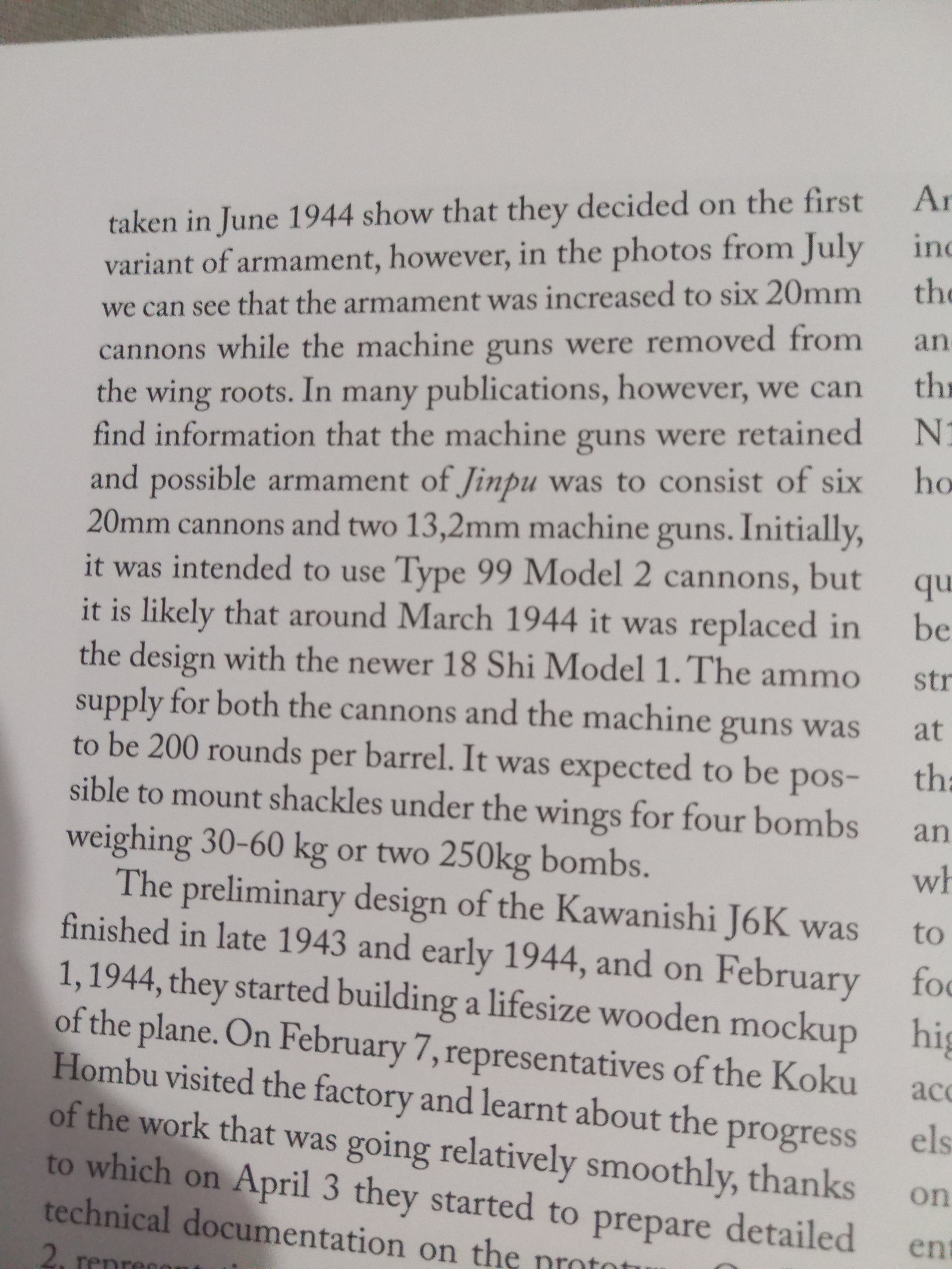 The book “Japanese Heavy Fighters 1937-1945” states that initially (June 1944 mockup) the J6K was to be armed with 4 x 20mm cannons in the wings and 2 x 13.2mm Type 3 machine guns at the wing roots, or 2 x 30mm cannons in the wings and 2 x 13.2mm Type 3 machine guns at the wing roots. However, in July 1944 the J6K’s armament was changed to 6 x 20mm Type 99 Model 2 cannons in the wings (200 rounds per cannon) and 2 x 13.2mm Type 3 machine guns at the wing root (200 rounds per machine guns)